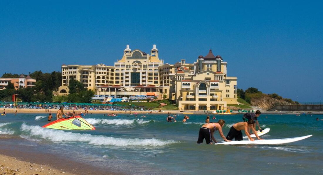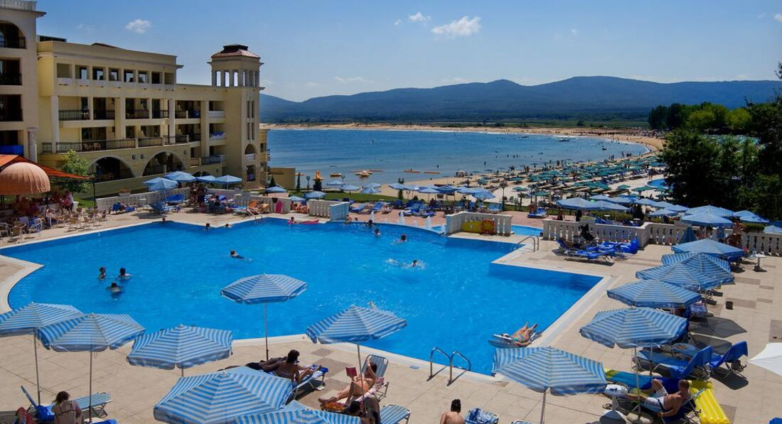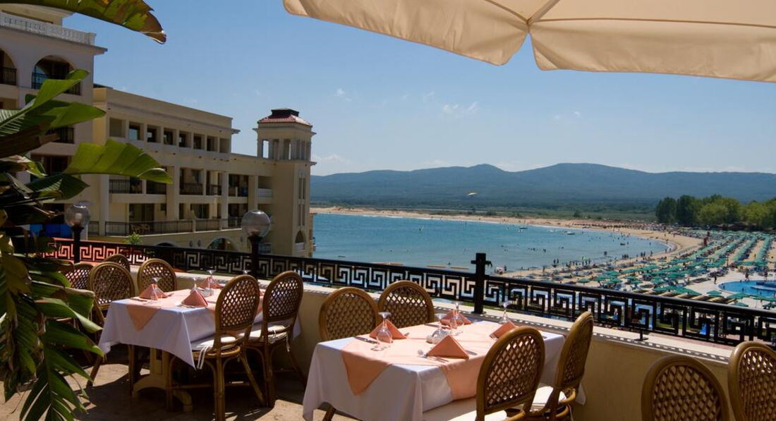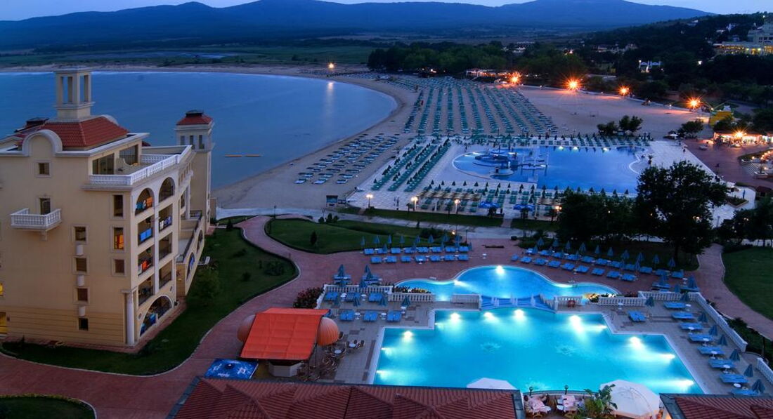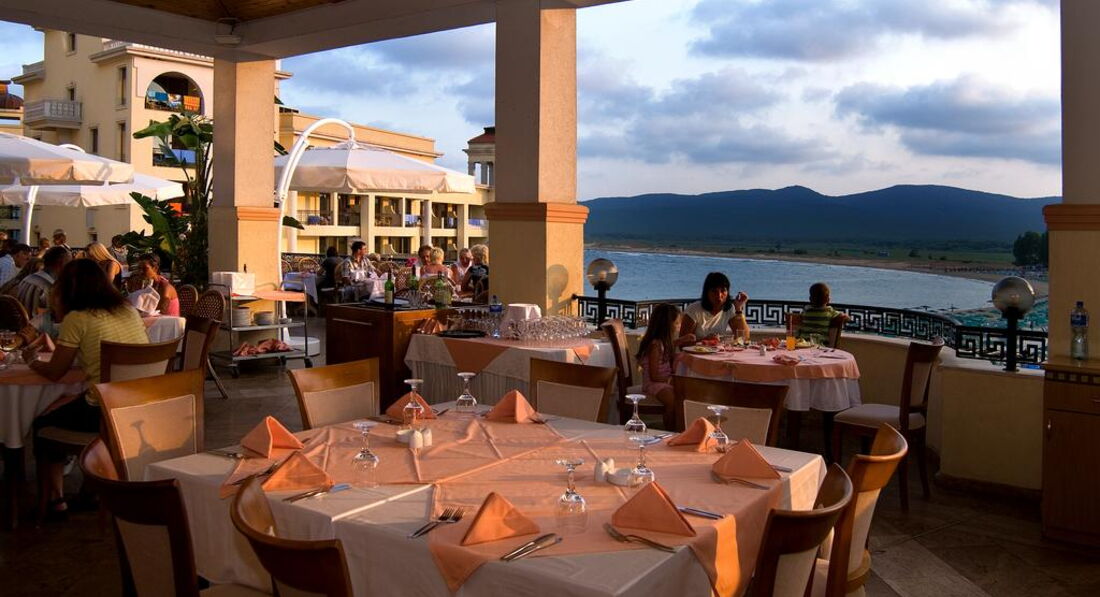 В Болгарии мы были первый раз, путешествовали с мужем и 2 маленькими детьми ( 5 и 7 лет) в период с 16 по 30 июля. В этот отель поехали, так как прочитали много положительных отзывов,да и расположен он в очень живописном месте у самого моря (это действительно так). Начну с размещения. По прибытии в аэропорт Бургаса встречавшие нас представители туроператора (Библио-глобус Бон тур) забрали у нас все ваучеры (в том числе и для заселения в отель) сказав,что они нам не понадобятся,так как в отеле уже есть все наши данные для заселения. Я специально еще раз подошла уточнить, но они не отдали обратно ни единого ваучера. Когда мы приехали в отель (около 10 утра), нас попросили предъявить ваучер и отказались заселять без него. Когда мы объяснили,что у нас их забрали в аэропорту,на ресепшене только развели руками и сказали,что теперь остается только ждать приезда представителя нашего туроператора где-то в 13 часов. Совершенно измученные после дороги мы этой новости не обрадовались,сами понимаете. Кстати,несмотря на то,что болгары все более-менее понимают по-русски,на ресепшене предпочитают делать вид,что абсолютно вас не понимают, так что мне здорово помогло знание английского)) В итоге,помаявшись полтора часа я догадалась,что можно позвонить в турагентство и попросить прислать на e-mail отеля ваучер в электронном виде (мы,кстати,не одни такие были,с нами в автобусе приехала еще одна семейная пара с 2 детьми,у которой изъяли все ваучеры). Им сразу же переслали ваучер (спасибо большое за оперативность) и нам дали номер 8333 (апартаменты),как мы и заказывали. После заселения нас ждал сюрприз-окно в большой комнате не открывалось,так как ручка была оторвана! При предварительном беглом осмотре мы этого не заметили-окно было зашторено. Я об этом сообщила на ресепшен,но техник только развел руками-мол,заказали,но ручку все еще не прислали. В течение двух недель нам окно так и не сделали и номер не поменяли. В итоге спали в душной,непроветриваемой комнате. Хоть детям повезло-у них балкон открывался)) Кондиционер в нашей комнате потек (как будто из крана вода) спустя неделю, но эту неприятность быстро устранили, и то Слава Богу)). По поводу сервиса ничего плохого сказать не могу,все официанты очень приветливые. Когда садишься за столик,сразу подходят и интересуются, чего бы вы хотели выпить. Конечно, нужно помнить про чаевые (в среднем мы оставляли по 2 лева горничной и официантам). Горничная убирала номер довольно хорошо,правда, постель меняла раз в 3-4 дня, но полотенца ежедневно. Нас удивило,что мини-бар только в 1 раз при заселении бесплатный,а потом нужно платить,и довольно много за пару банок газировки и минералки. В ресторане довольно вкусно кормят, но на 5 звезд все равно не тянет.слишком однообразно,хотя один раз устроили fish evening с мидиями,креветками и др.моепродуктами-очень здорово! Фрукты меня не впечатлили-в Болгарии не очень вкусные арбузы и дыни. Арбузы подчастую были не совсем свежие,персики зеленые и твердые. Море было теплое, но с большим количеством зеленых водорослей. Зато мы насобирали много ракушек (если копать, то можно найти большие закрученные раковины)) Дно пологое, самое то для детей. Пару раз были на шоу и в мини-клубе для детей. Шоу слишком пошлые для похода с мал.детьми (кстати,ходить нужно в соседний отель Холидей Вилладж), но один раз было шикарное шо