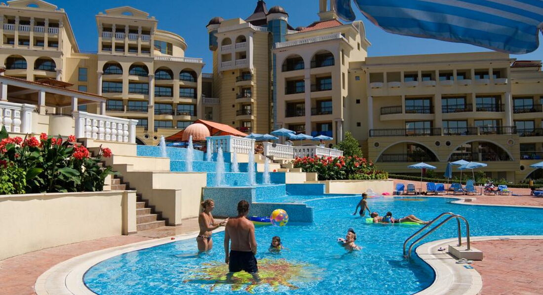 Отдыхали в июле в период 24.07.2012 по 06.08.2012. Заранее при ношу извинения за ошибки т.к пишу с ай пэда , а он странным образом меняет некоторые слова. И так началось все строго что я решила съездить в солнечную болгарию и поверить заверениям тур оператора что отель один из лучших, утопает в зелени, анимации целый день во общем отель для маленьких детей идеален! Ребенку 2,5 Лет. Заказывали индивидуальный трансформации, обещали машину и только наша семья. Принимающая компания альма- тур. Прилетели встретили довеезли. Разместили сразу, добавлю что брали стандарт с видом на море. Приехали в 23.00поэтому сразу спать легли. Всю ночь слушали странный гул, это я конечно утрирую т. К. Спать хотели уснули, утром гул не прекратился и вообще в основном здании гул повсюду думаю что система кондиционирования. Вид.... На большую автостоянки и углом видно море. Машины иногда подъезда тм чаще ночью и срабатывает сигнализация . Я злая пришла на ресепц , номер поменяли через три дня в другом корпусе который слева ближе км морю. Там тишина ни какого гула номер с потрясающим видом на прибой, мне понравился вид. Номер старый обшарканный по крашен экономно краской, подушки ужасные, постеленное белье дешевенькое жесткое. Минибар в номере платный в нем пиво гаденькое, кола пенсионер вода и все. Сейф платный во номере. Убирали в главном корпусе ужасно, когда пере селили я сразу стала оставлять щедрые чаевые убирала женщина хорошо, белье меняла раз в два дня. Вот что чаевые творят! Ладно смириться с номером можно, плевать что телевизор старый кинескоп ней, что русских программ два, все это пережить можно. Теперь о питании... Это господа трендец!!!!! Кормить малыша просто нечем! Причем аппетит у него хороший. Макароны дешевенькие всегда одни и те же, вареное куриное мясо, но оно просто не доваренное и не вкусное как резина, поэтому выбирайте маленькие кусочки , это все что предназначена для детей! Питье это синтетические напитки, кола фанта и прочая лбу день, кто пьет то найдете местные дешевые вина и пиво . Я не пью поэтому ничего не скажу. Ассортимент однообразный не вкусно кормят, редко что можно поесть, ребенка иногда удавалось прокормить супом куриным, его есть можно. Я потом из лотка где не доваренная резиновая курица лежала ложкой бульон наливала ребенку он ел. Спасибо хоть простокваша там всегда у меня ребенок только ее ел. И оладушки на завтрак. Очереди за едой. Что более менее есть можно быстро заканчивается и медленно при носится. Фрукты арбузы персики яблоки груши. Качество фруктов .. Ну что сказать кладут все что есть и гнилые тоже а чего? Туристы съедят! Во общем питание отвратительное!!! Не доваренное не дожаренное, переселение, острое и вообще готовят так на отстань!! Зато я там похудела!! И ребенок тоже! Дальше... Анимации для детей! Господа ее нет. Я имею ввиду маленьких детей, мини клуб это игровая комната душная с игрушками затасканными и печальными не довольными тетками вяло смотрящих на детей. Дети рисуют и лепят чего сами с собой. Ну и там конечно сидят детки страшно кашляющие так что ребенка я там не оставила. Около сов деповского магазина на территории отеля развлек уха ввиде паровозика который за деньги трясется. Площадка детская крошечная на песке. В отеле вирус кашель и температура мы подхватили уже на третьей неделе так что отделались нормально. И все больше реб
