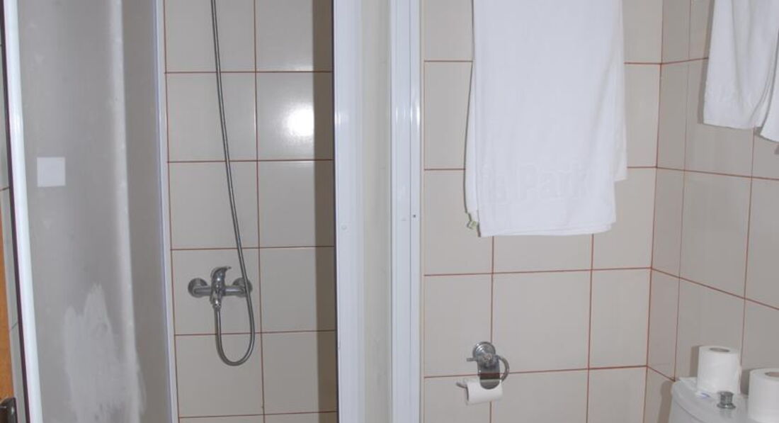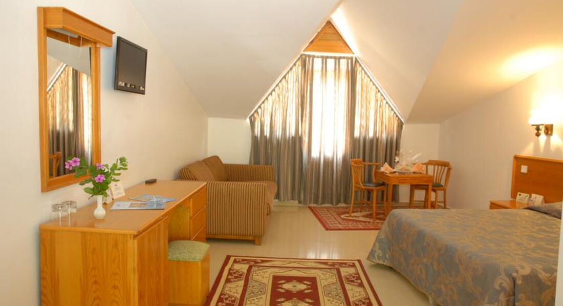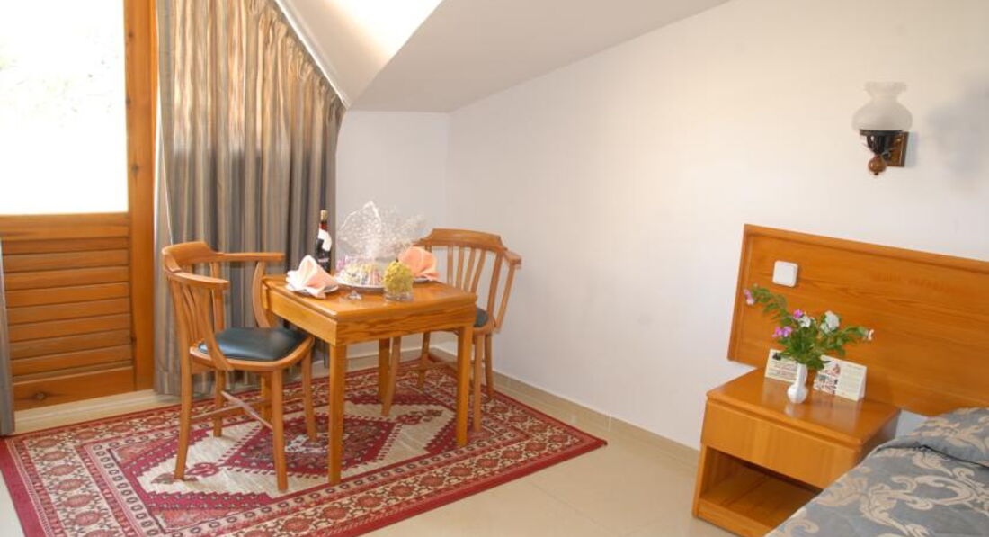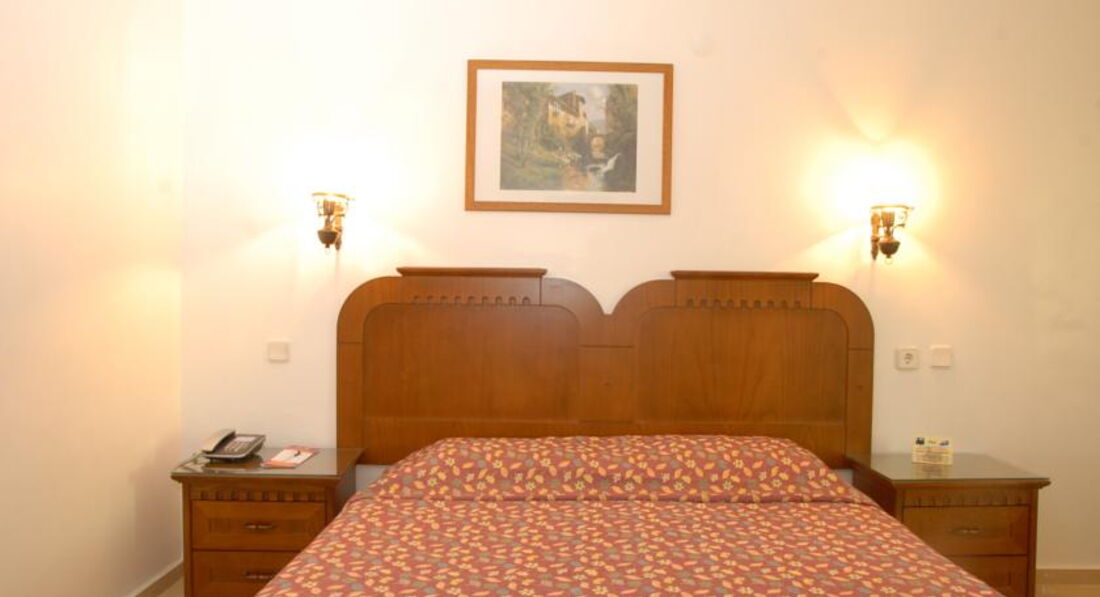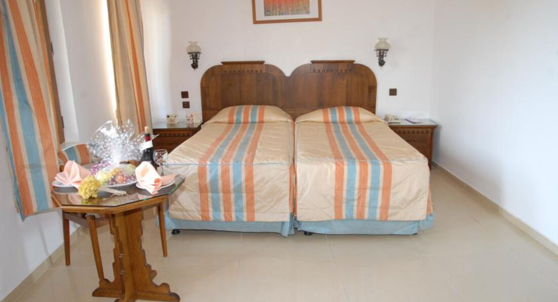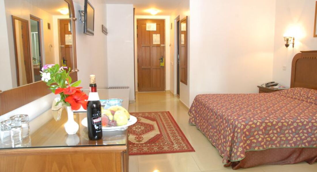 В отели нас заселили сразу,так как приехали вечером.Номер совершенно обычный,мебель старовата,но видно что санузел недавно ремонтировали.Постель чистая,кондиционер есть,но сейф платный(1,5 евро в сутки)-для меня это была неприятность.Поселили нас недалеко от моря,но очень близко к близлежащему отелю ,откуда каждый вечер доносилась громкая музыка(если вам очень тяжело уснуть-лучше поменять номер).
