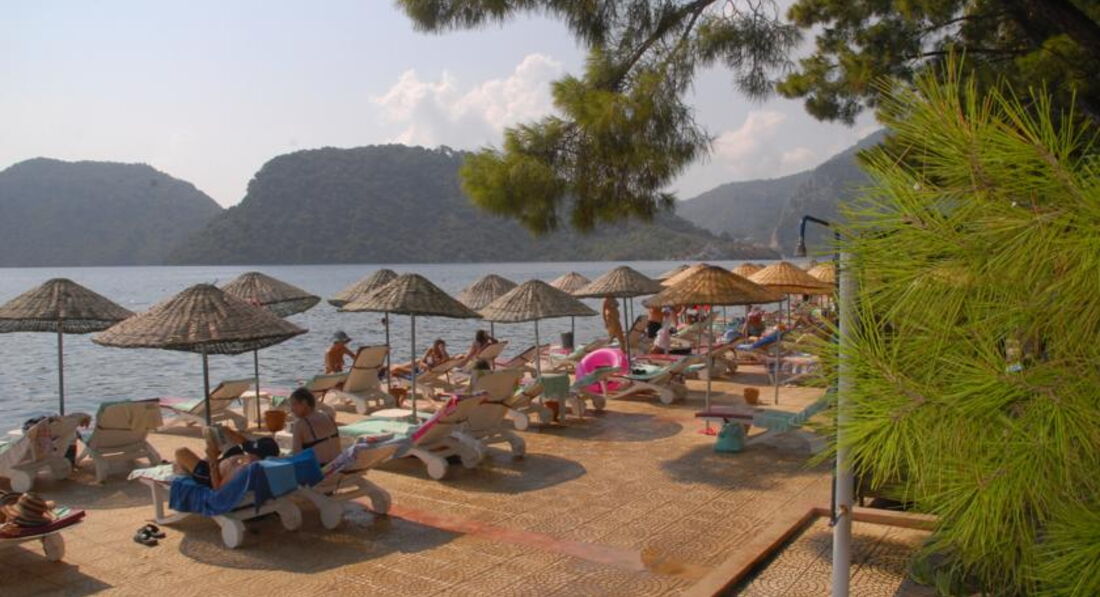 Плюсы отеля(встречали несколько семей, которые отдыхают здесь 2-3 раз):1)территория в тени средиземноморских сосен(подходит тем, кому противопоказано солнце), есть места В ТЕНИ на пляже(особенно после обеда). На пирсе, кому нужно солнышко, можно загорать на лежаках весь день. Лежаков достаточно, всегда находили свободный. Из деревьев есть эвкалипт, гранат, инжир, пальмы ...