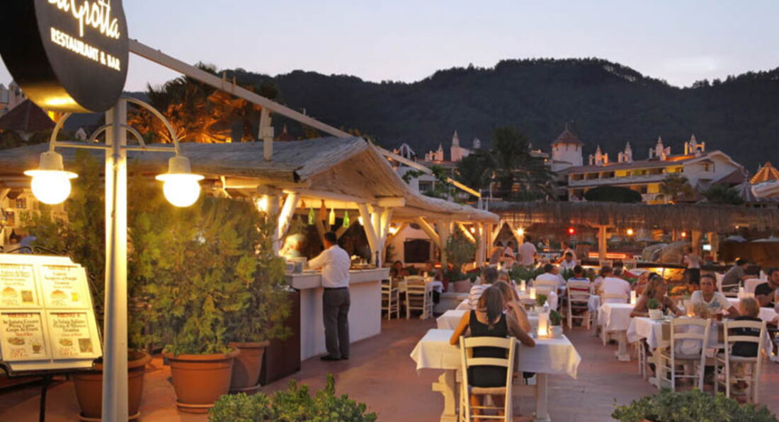 Бари та ресторани: головний ресторан розрахований на 400 осіб (критий, з кондиціонером, літня тераса, дитяче меню, дієтичне меню, дитячі стільці), лобі-бар (10:00-01:00), бар біля басейну (10:00- 18:00, бар на пляжі (10:00-18:00). 3 ресторани A la Carte: турецька, китайська - безкоштовно 1 раз за час проживання в готелі; італійська - платно, за попередньою резервацією.