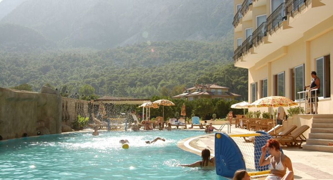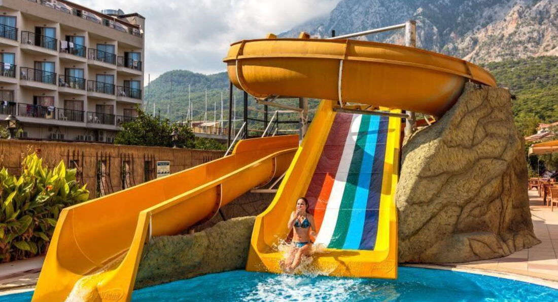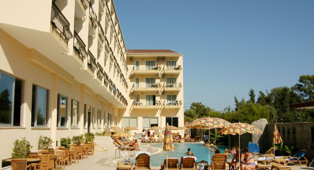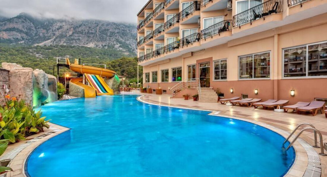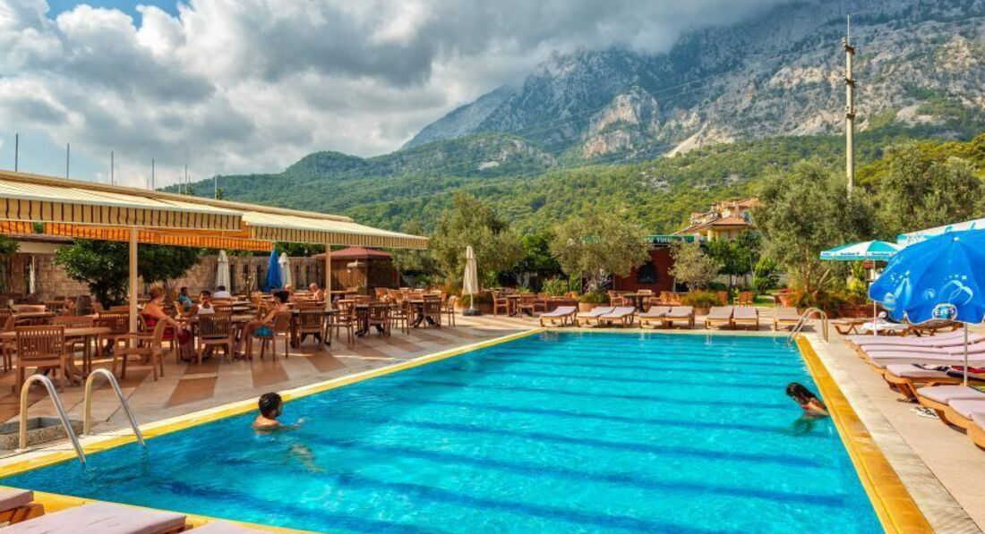 И так по порядку, отдыхали в конце сентября , по приезду где-то в 8.00 на рецепции оформили документы и нас отправили на завтрак после чего где-то в 11.00 нас уже заселили в номер безо всяких 10-20$ притом как мы потом узнали что у них чуть ли не принято селить в самые плохие номера, а потом только за деньги давать нормальные в кавычках.За наше заселение им 5.Сам отель находится на центральной улице где множество сувенирных магазинов.Номер дали на 3 этаже с видом на бассейн - сам номер старенький, мебель затертая, обои отклеиваются, сантехника тоже самое ( раковина умывальника вообще с дырой), хотя все работало кроме фена- починили на второй день заодно и умывальник чуть герметиком замазали.Мыло,шампунь в дозаторах розбавленые, убирали ежедневно, постельное и полотенца за 8 дней меняли 1 раз.В ресторане нормально не убрано, скатерти грязные, вечная нехватка приборов, попадалась плохо вымытая посуда.Очередь за едой.Еда однообразная, из мяса давали одну курицу и 1 раз жареное мясо которое кладут в шаурму, 1 раз давали жареную форель, остальное полуфабрикаты.Из фруктов - яблоки,сливы,зеленые мандарины,арбуз и вообще невкусную дыню.Из алкогольных напитков - водка, пиво, вино белое и красное. Территория отеля небольшая, на заднем дворе еще 1 корпус, альтанки, мини клуб для детей, детская горка.Интернет есть только на рецепции.К пляжу идти минут 5-7, сам пляж очень меленький, лежаков мало, а с тех что есть половина сломаны так что приходилось приходить очень рано чтобы занять лежаки.На пляже есть что-то типа ларька с водой,кофемашиной,и порошковым соком.Само море очень красивое и чистое, только камни, без специальной обуви(3-10$) никак.Для ребенка ездили на экскурсию в Динопарк он не далеко находится минут 10 на маршрутке(1.5$ проезд) 25$ входные билеты.В памуккале ездили с Hay-Tour правда они с утра до обеда возят сначала по всяким магазинам а потом на экскурсию, но зато дешевле чем брать у отельного гида.Также сами ездили на гору Tahtali (Olympos Teleferik) обязательно тепло одеться а-то там очень холодно. В целом отдых получился неплохой, но отель не понравился вообще 4* там и не пахнет!!!