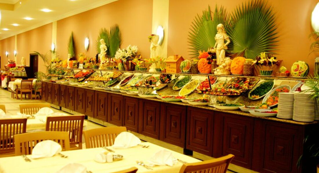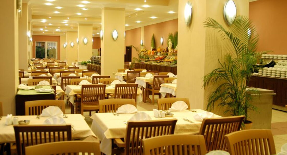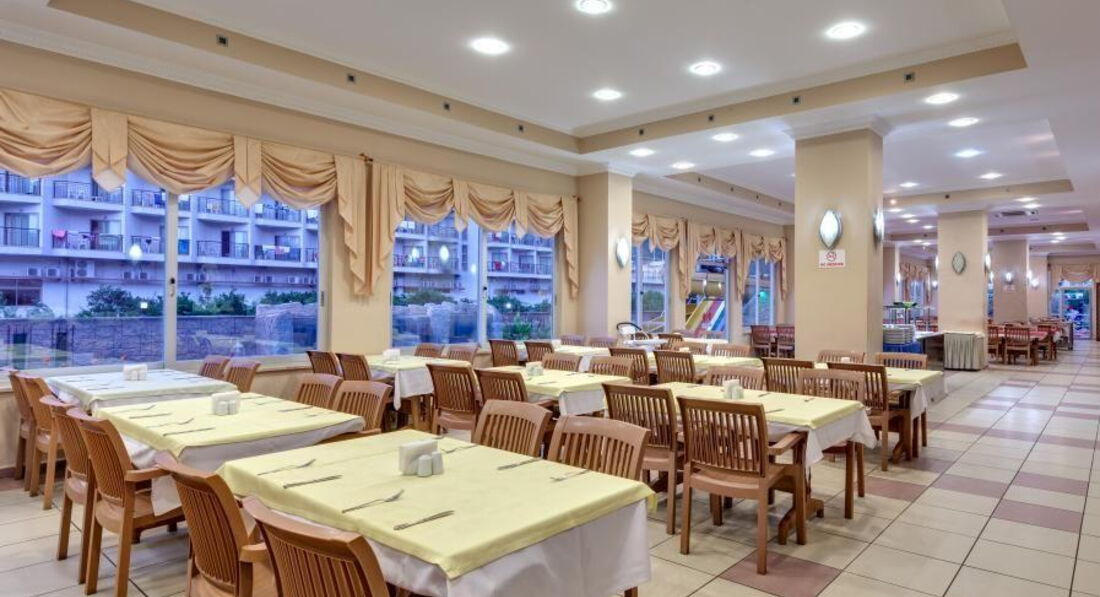 Ресторан : столы под навесом, на открытом воздухе, в самом ресторане, меню очень разнообразное, еды много, голодными вы точно не останетесь. Огромный выбор сладостей турецких и изумительно вкусные бисквиты с пропиткой, очень богатый выбор зелени , можно составлять ежедневно разные салаты на свой вкус ,лимоны нарезаны, соус и масло на выбор, много тушеных овощей, из мяса в основном курица, рыба жареная. Мясо красное и баранину турки сами в жаркую погоду не употребляют, поэтому и в отеле его не увидите особо. Арбузы, дыни ежедневно. Пиво, вино красное и белое, водка местная бесплатные, импортные напитки платные. Еда нам очень понравилась, есть из чего выбрать, шеф повар ежедневно выходил в ресторан, смотрел насколько довольны отдыхающие. В местных магазинчиках можно также купить клубнику и черешню за килограмм 2 доллара.