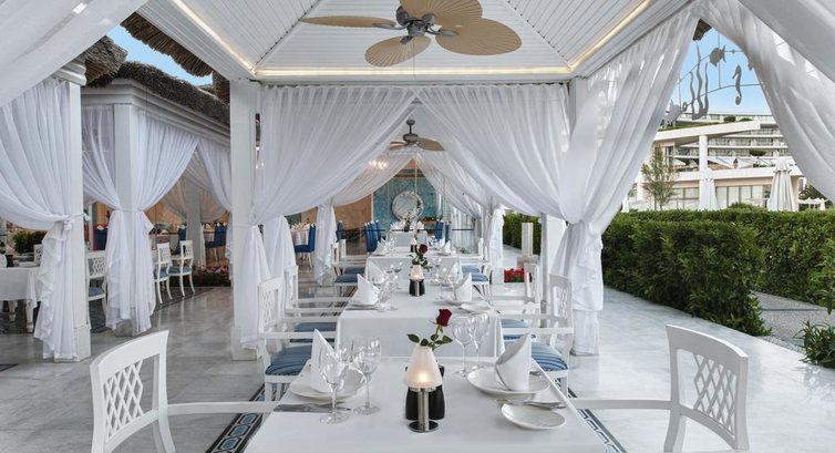 Бари та ресторани: головний ресторан (критий, з кондиціонером, літня тераса, дитяче меню, дієтичне меню, дитячі стільці), лобі-бар (08:00-24:00), бар біля басейну (10:00-19:00) , бар на пляжі (10:00-24:00), диско-бар (22:30-03:00), ірландський паб (10:00-24:00), кондитерська (10:00-22:00), снек-бар (10:00-24:00), Sun snaxx бар (10:00-19:00) кав'ярня (10:00-22:00, платно), Royal horse бар (22:30-03:00) , бар-бістро (22:00-19:00), гольф-бар (08:00-24:00, платно), боулінг-бар (10:00-24:00), Terrace lounge-бар (10:00) -19:00), центральний бар (08:30-24:00), тінейджер-бар (20:00-24:00), аквалаундж-бар (10:00-18:00), вітамін-бар (08: 00-20:00), шиша-бар (10:00-01:00, платно). 5 ресторанів A la Carte: азіатський, італійський, рибний, грецький, стейк-ресторан – платно, за попередньою резервацією.