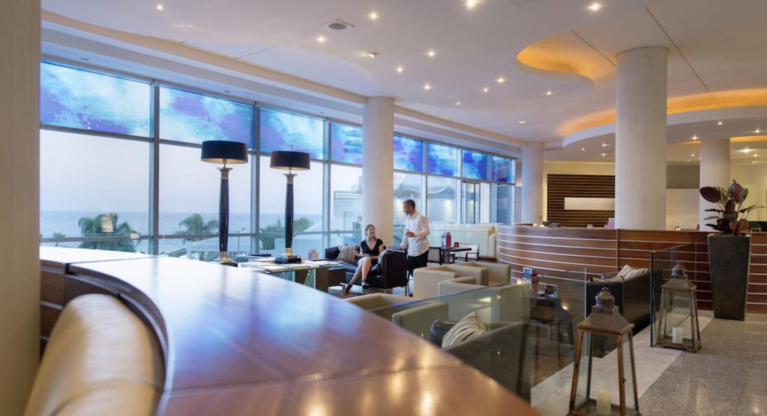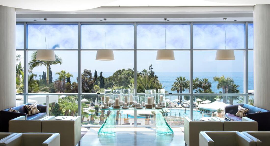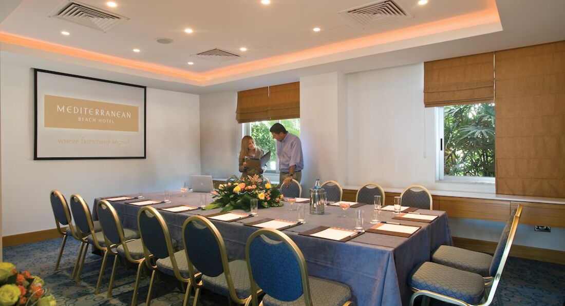 Mediterranean Beach – це рай. Так вважає кожен, хто хоч раз переступав поріг цього вишуканого готелю. Ідеальне розташування, комфорт та бездоганний сервіс принесли йому славу одного з найкращих на Кіпрі. Інтер'єри готелю - це щасливе поєднання сучасних технологій та споконвічно кіпрських традицій. Щоб краса була виразною, але не кричучою, у декорі використані м'які півтони. Плавні лінії декоративних елементів та делікатні форми меблів від класиків сучасного дизайну створюють атмосферу спокою, затишку та радості. Головна перевага готелю - нескінченне достаток сонячного світла, а також відчуття постійної та "живої" присутності природного пейзажу прямо в номері. Синє море, опалові пляжі, біло-червоно-фіолетові бризки квітів на фоні смарагдової рослинності нагадують створене талановитим художником мальовниче полотно.