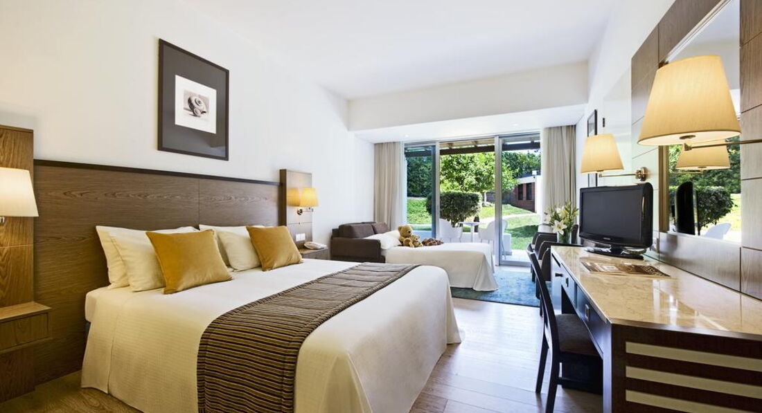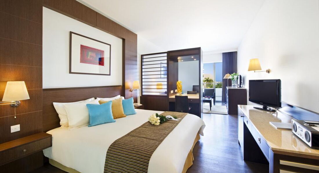 Deluxe room : 22,7 кв. м - балкон, спальня з двоспальним або 2 окремими ліжками, ванна кімната з ванною та душем. Вид на басейни та сад або на море.Family room: 30.8 м 2 - балкон або тераса, спальня з вітальнею, ванна кімната з ванною і душем. Вид на сад та море.