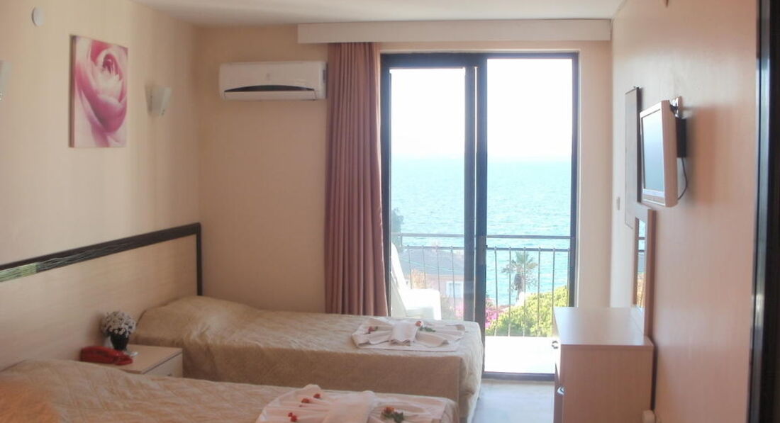 Заселили сразу по приезду, персонал доброжелательный. В номере подтекал кран и стояла вода (2005), но горячая вода была постоянно.Белье сменили и убрались 1 раз. Питание как обычно в таких отелях, из фруктов только арбуз,десертов нет. Месторасположение отличное! Море в 1 мин ходьбы, хочешь на платном 5лир за день, хочешь на бесплатном, море очень чистое.Экскурсии покупали на улице(цены в 2р дешевле Пегаса)Отель подходит для экономного , непритязательного отдыха.Самый большой минус-слышимость!