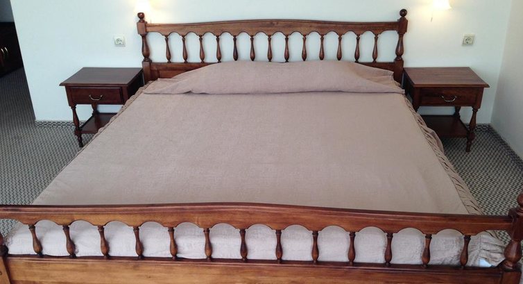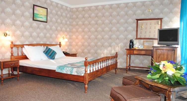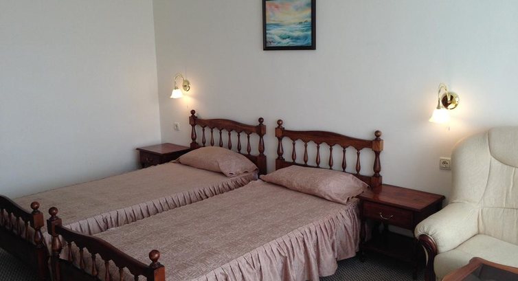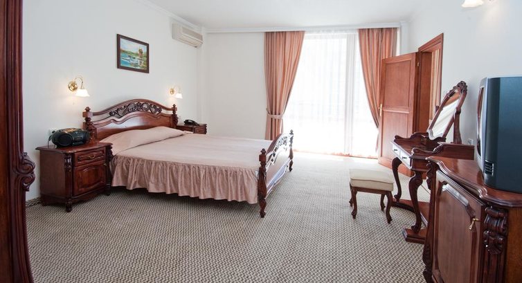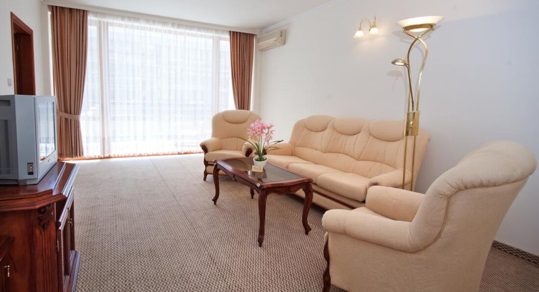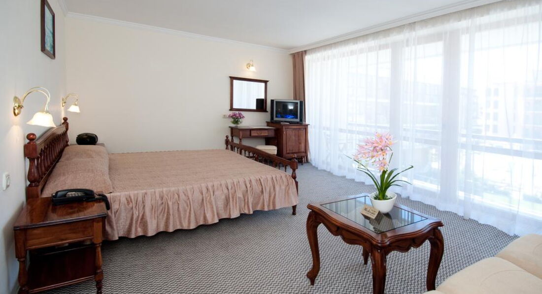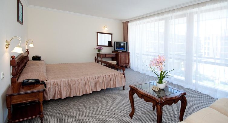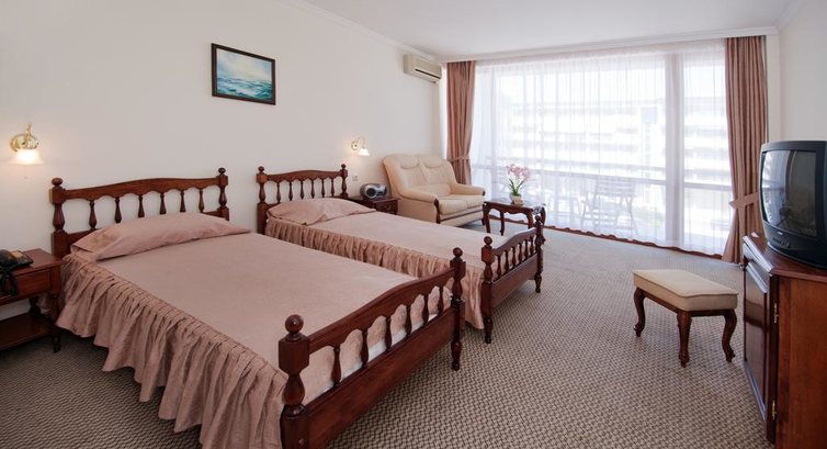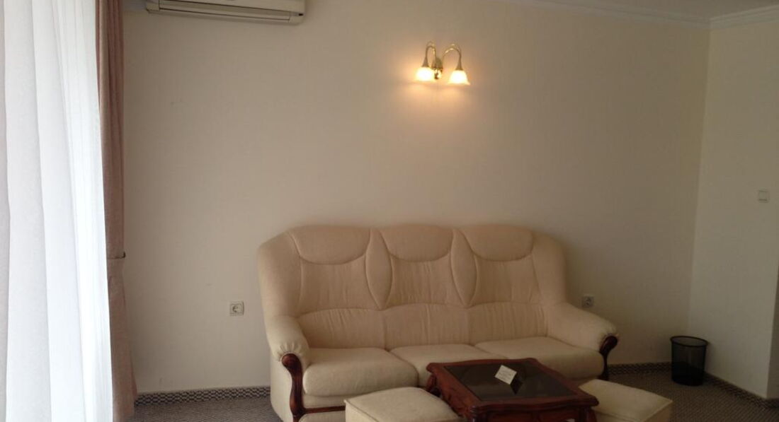 В номере у нас был обычный набор старенькой мебели, сантехника работала, постельное бельё и полотенца меняли ежедневно;шампунь,мыло,лосьон не добавляли. После 22.00 затихала весь день грохочущая музыка в фитнес-клубе( а наш номер был именно над ним) и было спокойно, но иногда мешала идеальная слышимость жизнедеятельности соседних номеров: храп, пользование с/узлом и даже икота)).Анимация мёртвая( мы приехали до официального начала сезона): говорят по-русски плохо, как ,впрочем, и весь персонал, но понимают, улыбаются.До пляжа 8 мин ходьбы,зонт, шезлонг- всё по 8 лева /день,но можно и на песочке неохраняемой зоны за 0)). Ежедневно была свидетелем эмоциональных бесед-объяснений сервисменов пляжных, которые гоняли русскоговорящих туристов, стеливших свои полотенца на платной зоне или у самого моря.