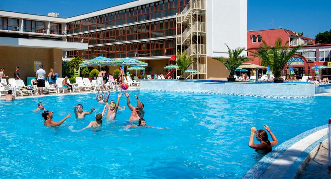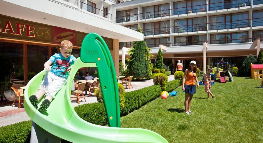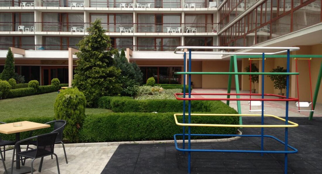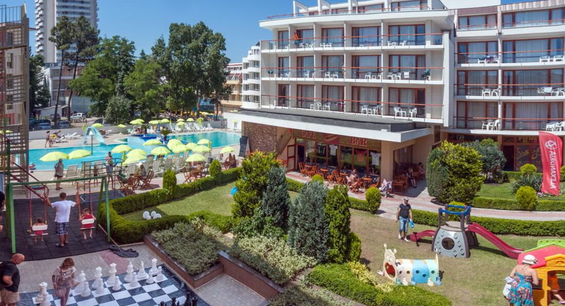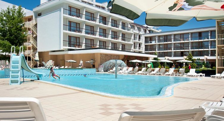 Мы с друзьями отдыхали в этом отеле в июне 2013 года. Брали тур на неделю — отдохнуть от всего и от вся. Друг ехал в этот отель уже второй раз и очень уговаривал меня поехать именно сюда. Самый большой плюс отеля это его расположение! В самом центре Солнечного берега но при этом не на самой шумной улице. Персонал на ресепшене и в барах/ресторанах очень вежливый. Когда мы заезжали нам дали номер с видом на казино. Это прямо скажем не самый лучший вариант и поэтому на следующее утро я пошел менять номер. Нас переселили в номер 306 — там тихо и можно нормально выспатся. Еда довольно однообразная, как и во всех отелях по системе питания все включено. Не то чтобы не было выбора: и рыба и мясо и птица каждый день присутствовали, просто как то к пятому дню мне все это совсем надоело и захотелось домашней пищи: борща какого-нибудь, колбасок острых и т. д. Но мы быстро решили эту проблему найдя приличную механу неподалеку с добродушной хозяйкой. Так что отдыхом я остался доволен=) Кстати, довольно приличное количество отдыхающих с детьми в этом отеле — так что если у вас есть маленький чертик, то вперед...
