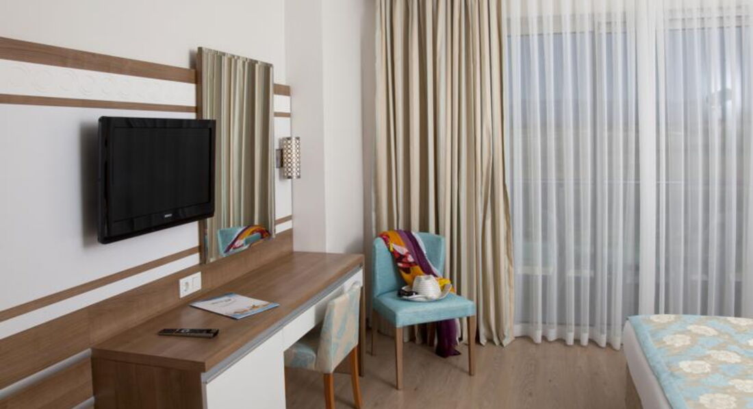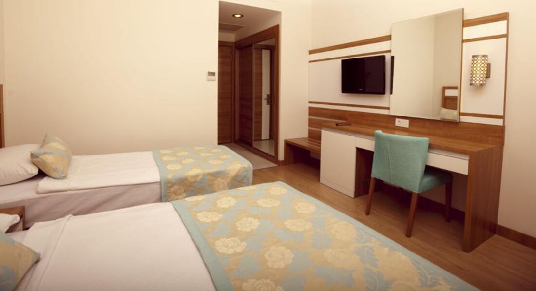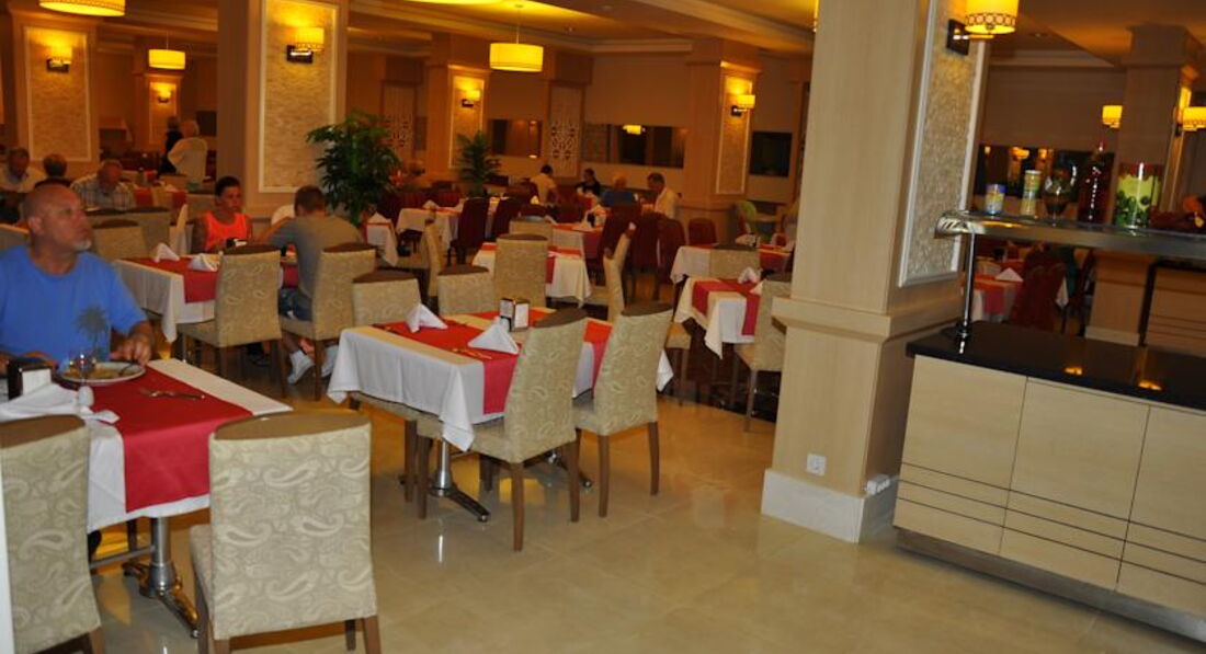 Напишу и я свой отзыв, пока свежи воспоминания. Мне отель понравился, свои четыре звезды он получил заслуженно. В некоторых пятерках хуже. Ну а теперь по порядку. Питание, с моей точки зрения, вполне неплохое. Было все: и рыба, и мясо (говядина), и кура, и индейка, и овощи, и фрукты, и сладости, ну в общем, как и во всех отелях Турции. Номер нам попался вполне приличный, на 4 этаже с двумя балконами, один из которых был французский. В номере убирались каждый день, не скажу, что идеально, но вполне приемлемо . Холодильник работал, кондей тоже. В отеле есть анимация, как детская, так и взрослая. Про детскую ничего не могу сказать, взрослая – простенькая, ненавязчивая. Были вечерние шоу, живая музыка, турецкая ночь с выносом огромного торта из мороженого, пляжные игры, аквааэробика, танцы живота, караоке и т.п. Пляж песчаный, море теплое, лежаков хватало всем, хотя отель и загружен на полную. Одно но – очень мелкое море, замучаешься идти до глубины, хотя может это для кого то и плюс – особенно для детей. Можно смело отправлять их купаться. Бар на пляже неплохой, еда вполне приличная, из алкоголя – только пиво. До пляжа идти 7 – 10 минут не торопясь. Одно плохо – нужно переходить дорогу, и хотя там есть пешеходный переход прямо напротив отеля, переходить очень боязно, т.к. в Турции почему то водители не уступают пешеходам на переходе. Т.е. детей, даже подростков, особо одних не отпустишь. На пляже есть плавучий понтон, который ведет к пиратскому паруснику. С понтона очень хорошо нырять – вода прозрачная. Видно много рыбок, которых можно покормить. Перед входом на понтон работают люди, которые продают туры на этот парусник. Советую обратиться к милой девушке из России по имени Ольга. Она обо всем расскажет и сделает скидку. Есть бесплатная сауна, хамам, паровая баня. И что интересно почти всегда они были пустые, т.е. можно в любое время придти и посетить эти заведения в свое удовольствие. Есть там небольшой косячок – они, видимо, не понимают, как регулировать температуру в паровой бане. Там либо очень жарко, либо холодно. А надо то всего выставить тем-ру контроллера. При хамаме работают массажисты. Самый главный там Александр. Предлагают пройти тестовый бесплатный массаж, на котором вам скажут ваши проблемы. Я не советую его проходить, т.к. у вас в любом случае найдут кучу проблем, им ведь надо зарабатывать денежку, а могут во время тестового массажа сделать так, что и действительно что то заболит и тогда уже без массажа не обойтись. В общем если не планируете покупать у них курс массажа, то и не стоит вестись на халяву. В хамаме же меняют полотенце, хоть каждый день, но только в определенное время. Если вы вдруг потеряете полотенце, не переживайте – в хамаме можно всегда найти брошенное кем либо полотенце и сдать его как свое.