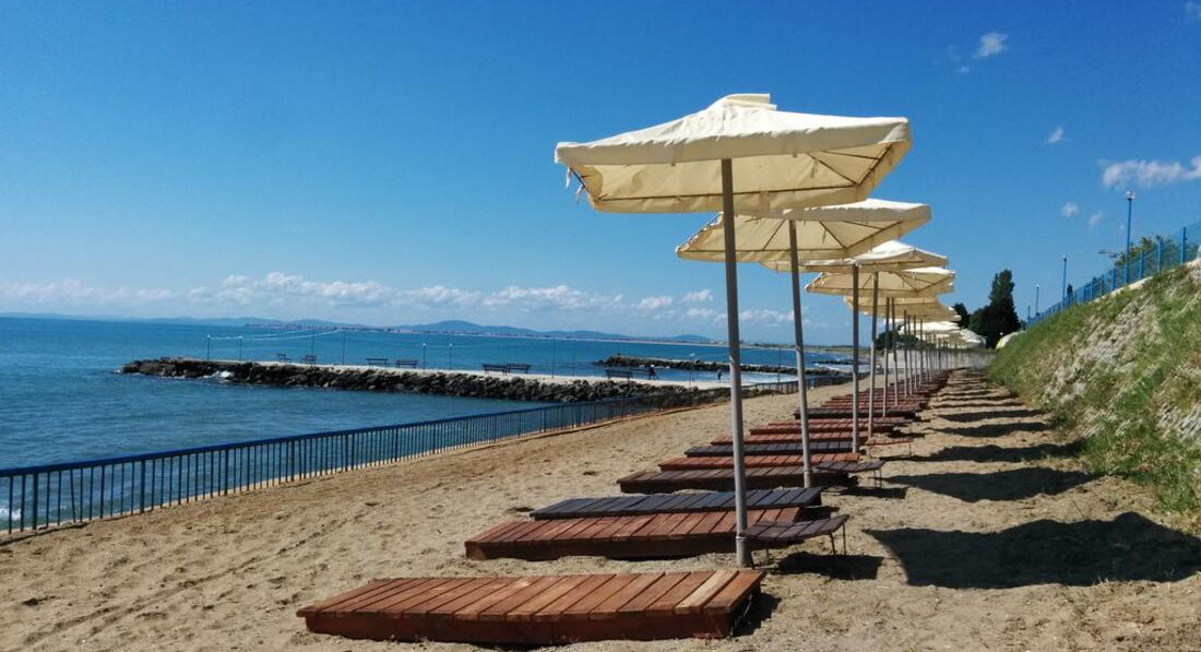 Пляж: двухуровневый, на верхнем уровне шезлонги стационарные, разбитые и видавшие уже виды, на нижнем уровне узкая полоска песка, посидеть там не получится. И еще - в первый же день приезда был дождь и шторм, набило водорослей, и за 2 недели их так никто и не убрал, мы с детьми в этой жиже из зелени купаться не хотели. Пару раз ходили на дикий пляж за территорию отеля, выезжали на Солнечный берег и перебивались бассейном.