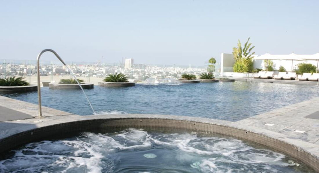 Очень удобным моментом в отеле был бассейн. В него можно попасть, выйдя из лифта на 5 этаже, пройдя через переход на парковку и там поднявшись на 12 этаж. (В качестве полезной информации - в туалет можно пойти, спустившись на лифте на 11 этаж в спа-центр). После того, как мы съездили на пляж и не получили удовольствия, так как в начале февраля температура воды была 21 градус - что терпимо, но для нас не комфортно - мы почти каждое утро после завтрака ходили в бассейн. Вода в нем подогревается, а в джакуззи - даже горячая. Очень забавно, как персонал научился бороться с излюбленной привычкой русских занимать лежаки - парень предупреждает, что полотенца могут полежать на лежаках не более 30 минут, а потом он их уберет. Были дни, когда около бассейна было не больше 6-7 человек, но в некоторые дни гости даже лежали на травке. С бассейна через стеклянную перегородку прекрасный вид на город!
