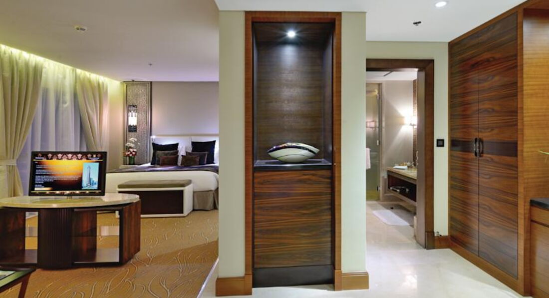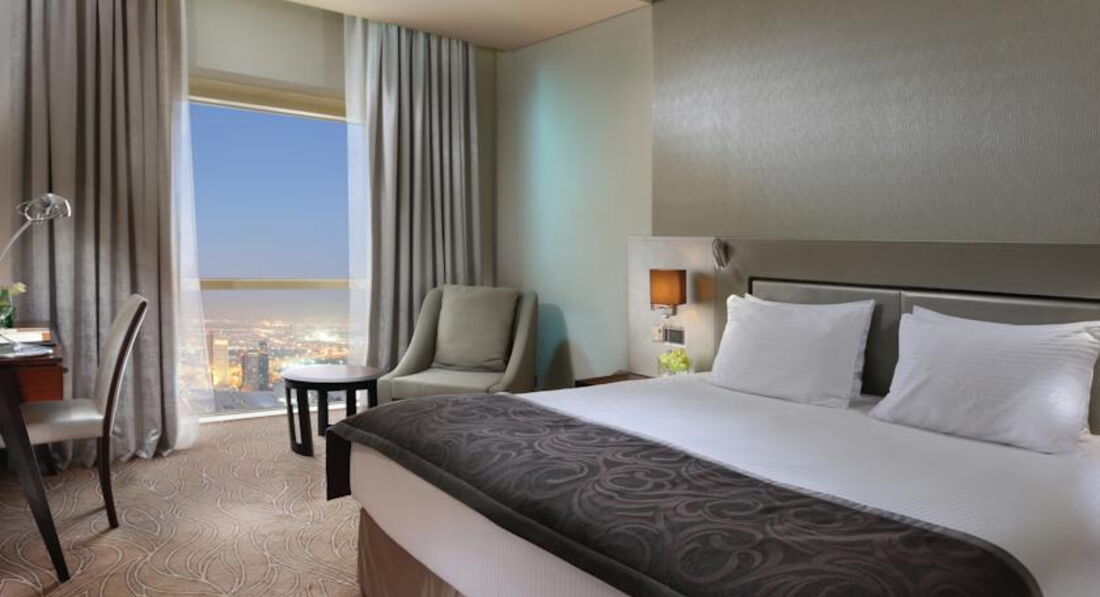 В ОАЭ в третий раз. До этого приезжал в качестве туристо и селился в Шардже. В этот раз выпала командировка. Летели регуляркой Аэрофлота на А-320, визы делали самостоятельно через агентство в Дубае. Необходимо было выбрать отель в центре города поблизости с Dubai Exhibition Center. После небольшого сравнительного анализы выбрал этот отель и не прогадал. Все очень стильно, качественно, а временами даже помпезно. На ресепшене оказалась русско говорящая девушка. К сожалению не запомнил ее имени, но что-то типа MAYA или MAVA. Простите, если ошибся. Так вот, с ее помощью регистрация и расселения заняли не более 15 минут. Мне дали номер на 42 этаже. Лифт туда взлетает за считаные секунды. Вечером вид просто потрясающий. Сам номер очень комфортабельный - 2 пары тапочек, 2 халата, сейф, санузел из 3-х частей (собственно унитаз + биде / душ / ванна + раковина), разделенных между собой стеклянными перегородками, накрахмаленные полотенца, 2 хоть и раздельные, но весьма широкие кровати (когда сдвинул их вместе, получилось нечто полуторного Кинг Сайза :)), на стене плазма. Из русскоязычных каналов нашел только Евроньюс, РТР Планета, Россия 24 и Шансон ... вот уж не ожидал ...