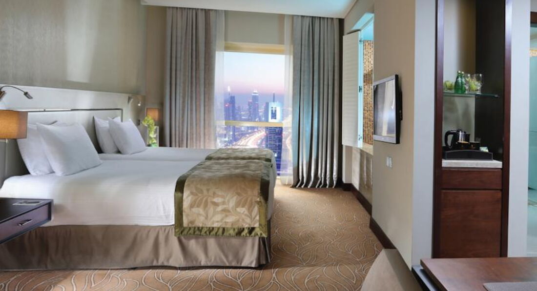 Доброе время суток! Вчера вернулись из отеля! Отель новый, номер и вид из окна потрясающий! У нас вид был на башни-близнецы одна из достопримечательностей Дубай. Большая комната, огромная ванна, в номере есть все необходимое. Мы прилетели утром, так что заселения пришлось подождать часа 2 и взяли депозит с 3 человек 200 долларов. При отъезде вернули остаток дерхамами и не по очень выгодному курсу. Если вы будете пользоваться мини баром, спа, кафе, телефоном и заказывать напитке на ужине и на обеде все вычтут из депозита или если превысите сумму необходимо доплатить. Внимательно читайте счет при выселении, с нашими соотечественниками и с нами были неприятные ситуации нам дописали доплату за 3 кровать, за которую мы заплатили в турагентстве, с других взяли оплату за мини бар, который по их словам они не трогали. Если вы не знаете английского то вам будет тяжело им что то доказать. На ресепшене не всегда есть русскоговорящий гид, и вообще весь персонал разговаривает на английском языке. У нас возникало за время отдыха ряд вопросов, которые я могла объяснить и получить ответ или помощь. Людям которые не говорят на английском во многих ситуациях будят тяжело. Отель больше предназначен для деловых поездок, командировок. Много европейцев и арабов в деловых костюмах и в элегантной одежде, в отличии от русских которых сразу было видно по спортивных костюмах и сарафанах на завтраке. Так что совет берите более консервативную одежду. Много арабских женщин и мужчин в национальной одежде, так что даже идя к бассейну в шортах чувствуешь себя не очень уверенно. Теперь о приятном питание разнообразное, суши и роллов как писали в предыдущих отзывах я не видела но блюда на любой вкус, видно с учетом отдыхающих в нем людей с разных стран и разной культуры. Бассейн очень понравилась, вода теплая, в джакузи горячая, лежаков всегда хватало, в основном все русские загорали. Расположение отеля тоже очень удобно, при выходи из отеля напротив сразу станция метро и рядом остановка такси, в любую часть города можно быстро добраться. Итог отель понравился, все на высоком уровне, интерьер, обслуживание, но больше предназначен для туристов которые хотят заняться шоппингом или посещать экскурсии. Всем желаю хорошего отдыха и массу новых впечатлений!