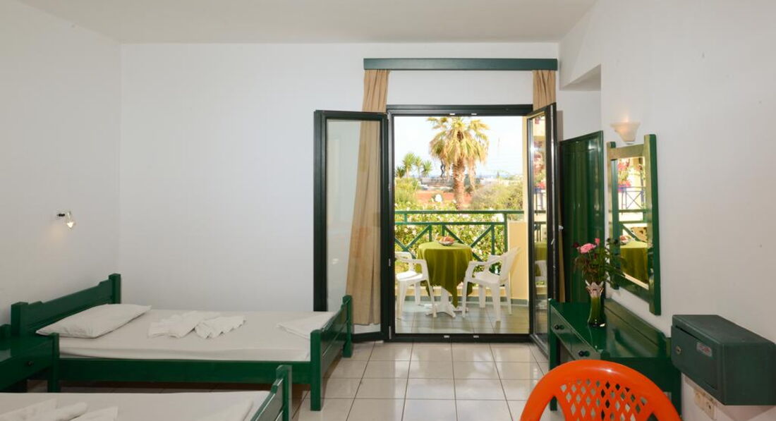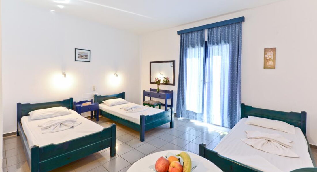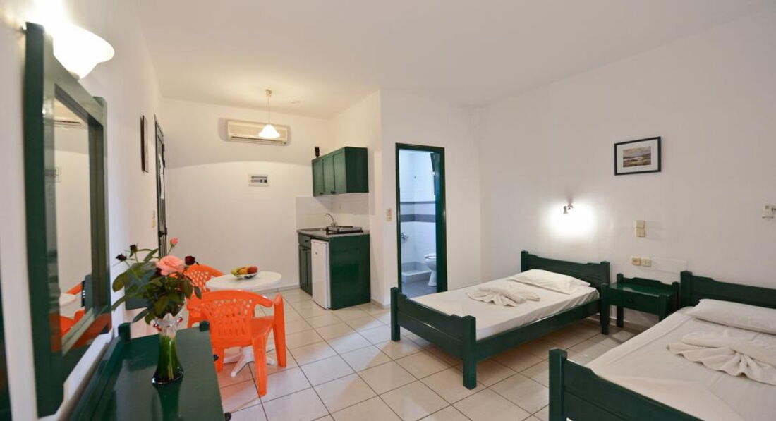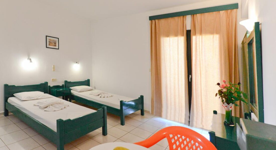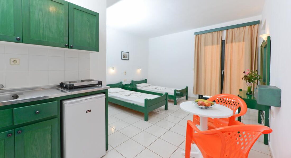 Типи номерів: • 10 Studio 2 pax (0-2 поверх, 15 м2, вид на море або сад, макс. розм. 2 чол., одна спальня та ванна, обладнаний кухонний куточок, балкон – у 8 номерах, тераса – у 2 номерах, вікна у всіх номерах). • 4 Studio 3 pax (0 поверх, 20 м2, вид на басейн, макс. розм. 3 чол., одна спальня та ванна, обладнаний кухонний куточок, вікна, балкон та тераса – у всіх номерах). • 6 Superior Studio 3 pax (1-2 поверх, вид на море, вид на море, вид на басейн, 25 м2, макс. розм. 3 чол., Обладнаний кухонний куточок, балкони та вікна у всіх номерах).У номері: • душ • кондиціонер (7 євро на день) • електрочайник • міні-холодильник (безкоштовно) • 2 стільці • wi-fi (безкоштовно) • сейф (платно)