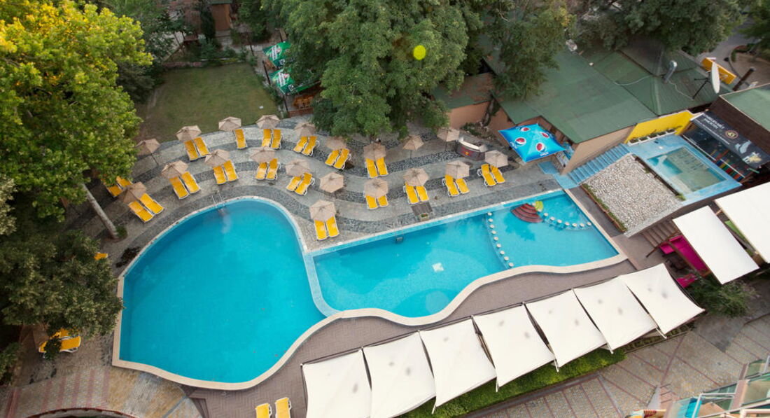 Расположение в центре Золотых Песков, кто любит спать в тишине, ищите что-то подальше, с одной стороны одна дискотека, с другой, другая и до 5 утра. Нам не очень мешало, много ходили. уставали и спали хорошо. Были с детьми 3-х и 10 лет. Площадка детская одно название, качель и лестница, бассейн очень маленький и в теньке, вода холодная. Вообще в бассейне не купались, на море все таки приехали, буквально пару раз,. Как и везде занимают места с вечера. меня это слегка раздрожало, займут места и весь день они пустуют, мне не понятно. Много в отеле немцев, многие о них плохо отзываются, я ничего не могу сказать, не сталкивалась ни с их хамством ни с пьяными. Сидят весь день у бассейна возле бара и все. Напитки из все включено пить не стоит, дешевка одна, мы все сами покупали и коктейли и вино, оно, кстати, у них замечательное, такого нигде я не пробовала. А в баре бесплатно не подойдут, а если и посчастливится, нальют пойло. Дискотека для детей нормальная, если бы не телухи лет 20-25, которые видимо разминаются перед походом в ночной клуб, пляшут тряся своими телесами с малышами, толкают их и роняют. в общем тут недоработка персонала. Шоу были всякие, иногда откровенная пошлятина, даже смотреть противно, иногда юмор из разряда пукнуть и срыгнуть, много на шоу детей, им как раз смешно, впечатление среднее, не плохо ни хорошо. Аниматоры с утра видно с большого будуна, опухшие и мятые. Много в отеле румынов с многочисленными детьми, тут же родители пьют и курят и с ними ребятишки, зрелище мягко говоря не очень, есть немцы, русских не очень много, белорусы, тихие, спокойные, семейные.