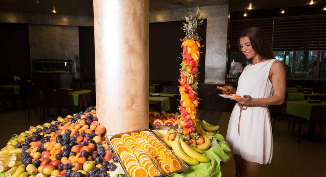 Питание на мой взгляд отличное. На завтраки есть все...и блинчики при вас пожарят и омлет и все что хотите..Кашу не пробовала, пюре картофельное тоже не ели..(зачем для этого в отпуск ехать) Обеды и ужины практически одинаковые, но если у вас есть хоть не много фантазии, всегда в ваших силах их разнообразить, а не брать одно и тоже...Выбор достаточно большой...(это в ответ на предыдущие отзывы, кому там есть было нечего)..По поводу, что там помидоры и огурцы нарезаны отдельно, так сделайте себе сами салаты...там и капуста и лук и морковь и укроп с петрушкой отдельно были приправы, заправки, маслины, оливки грибы и т.д.Приложите усилия и мозги для себя..Рыба для меня тоже была не вкусная...Но это не значит, что она плохо приготовлена..Просто не мой вкус и все...Фрукты были в полный рост..и всегда...