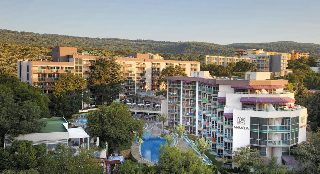 Отдыхали в этом отеле в июле 2012 года. Всё, что мы читали в отзывах перед поездкой оказалось правдой. Номера хорошие, с балконом, с кондиционером, с телевизором. Минибар в номере представляет собой маленький пустой холодильник типа" Морозко". Бельё в отеле старое, сероватого цвета. Полотенца тоже покупали очень давно. О том что такое сервис в этом отеле не знают. В номерах нет никакой информации о том как позвонить администратору или в другой номер, Листочки с информацией, лежащие на столе в номере давно устарели. Так, например, в них написано, что мы можем воспользоваться сейфом на ресепшен по цене 4 лева в сутки. Но придя на ресепшен, они покажут вам другой листочек, где будет написано 6 лев. в сутки. Объясняют они это очень просто- не успели заменить. Мы жили 2 недели, так и не поменяли эту устаревшую информацию. Фена в номере нет, утюга нет,да к тому же и розетки не работали. Дали заявку- через день сделали. Территории у отеля практически нет. Бассейн и лягушатник занимают пространство между двумя корпусами отеля. Возле этих бассейнов стоят лежаки и зонтики настолько близко к друг другу, что пройти между ними практически не возможно. Мало того- политика отеля такова, что разрешено занимать эти места бесплатного пользования. Поэтому, выходя с ребёнком после завтрака к бассейну можно увидеть все эти лежаки, покрытые разными полотенцами, тряпками и зонты, которые вынули из держателей и спрятали под матрасами лежаков. В этом случае вам останется сидеть на голом асфальте или на бордюре бассейна. А занятые лежаки и зонтики могли простоять пустыми до 16 часов. При этом мы наблюдали несколько раз " битвы" за эти лежаки. Неприятное впечатление. Вечером по системе " всё вкл." в баре собирается народ. Работает один бармен и , соответственно, создаётся очередь. После того, как наши дети простояли за колой 20 минут в очереди, мы больше не пользовались услугами бара. Бельё нам поменяли через 7 дней и то, после определённого разговора с руководством. Объясняют просто- было некогда, было много другой работы. Правда, потом приносили в номер шампанское и фрукты и извинения, но настроение было испорчено. Это об отеле. Про курорт: действительно шумно до 5 утра. Но мы гуляли с детьми до 12 ночи- много атракционов, кафе, паровозики ездят. Интересно и весело. Приходили уставшие, ложились спать, шума не замечали. Ходили в аквапарк. От Мимозы минут 15 пешком. Очень понравилось. Стоит взрослый билет 33 лева детям выше 120 см. такая же цена. Маленьким детям цена 15 лев. Брали напрокат авто и ездили в Албену, Балчик и Калиакру. Если вы захотите приехать в Болгарию оч. советую выбирать Албену. Море в Албене и пляжи лучше, чем в Золотых Песках. Там пляжи принадлежат отелям. А в нашем случае- пляж городской, лежаки( 8 лев), зонты(8лев) и матрасы(3лев) платные.Море грязное, очень многолюдно. А хотелось бы поменьше людей, побольше природы. В Турции нам понравилось больше( если говорить о детях).