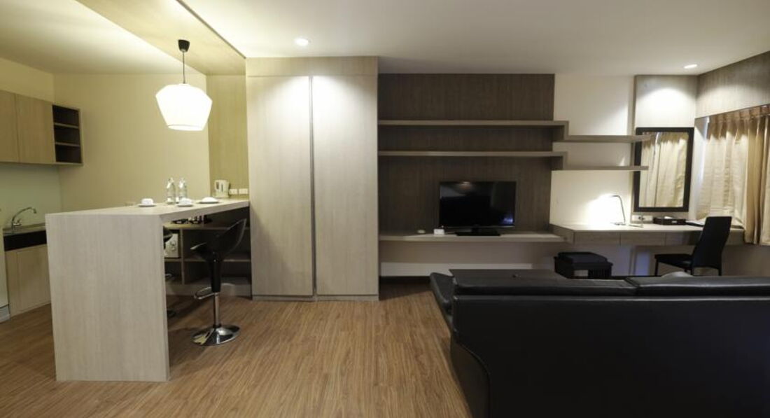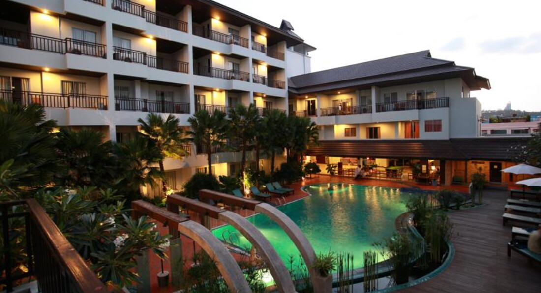 Ездили в этот отель с мужем, были с 25 декабря 2013 по 3 января 2014. Тур был от оператора Библио глобус, к ним претензий нет, все понравилось. Заселили нас сразу же, потому что приехали вечером. Ехали с аэропорта Бангкока часа 3 (была пробка). Сразу скажу что нам не повезло с погодой, днем было тепло (не жарко, а тепло), вечерами ходили в кофтах и штанах. Выбирали отель не по близости к морю, так как в Тайланде уже были и сделали вывод что можно взять байк и ездить куда угодно, главное чтобы отель был хороший. По фото отель понравился. Посмотрела по карте, рядом есть рынок для местных (в прошлый приезд в Тай мы на таком же еду себе покупали). В отзывах писали что в шаговой доступности есть магазинчики. Нас это устроило. Отель оказался симпатичным, все как на фото, красивые бассейны, ухоженная территория. Номер бронировали люкс, он трехместный, двухкомнатный. В спальне: 2 кровати, одна двухспальная, вторая односпальная (на ней наш ноутбук спал), шкаф для одежды, зеркало со столиком, кондиционер, прикроватные тумбочки со светильниками, окно выходило на наш балкон. Во второй комнате (кухне-столовой): кожаный диван, телевизор на шкафчике-комоде, журнальный столик, большой стол (обеденный) и стулья, холодильник, микроволновка, раковина для мытья продуктов и посуды, и еще какой-то стол (нам был лишний), кондиционер. В номере было 2 кондиционера, но мы ими не пользовались, так как замерзали и без них, а на нагревание они не работают. Про с.у. писать не буду, там все нужное было! Приехали вечером, очень устали, добирались почти сутки, потому не особо рассматривали номер. Утром обратила внимание что на полу валяются черные волосы, получается что перед нами пол не мыли. И так эти волосы и валялись до нашего уезда, пол видимо не только не мыли но и не подметали, за 11 дней нашего в нем проживания (ходили по номеру в тапочках, одноразовые были в номере). Уборщица приходила ежедневно. Заправляла кровать, мыла чашки от кофе (если мы их не помыли), приносила воду. Несколько раз меняли полотенца. Окна нашего номера выходили во двор отеля, с видом на бассейны, вид красивый, но получилось что в номере всегда была тень, полумрак, чего мы не любим (угнетает и хочется спать), но это мы не любим, а кому-то может нравится. Из русских каналов у нас показывал только один - Россия 24 (новости все время). На завтрак мы не ходили. Персонал отеля на ресепшн улыбчивый, всегда стараются угодить. Очень трепетно готовились к нашему Новому году. Украсили весь отель: в холле искусственную елочку ставили, все пальмы около бассейна украшали гирляндами (лампочками). Очень хороший Новогодний ужин был, столики стояли вокруг бассейна, русский ведущий проводил конкурсы и развлекал шутками весь вечер. В отеле можно было взять в аренду байки, но как оказалось они за ними не следят, не ремонтируют, потому вся резина на них испорченная, колеса спущенные и даже если подкачать, всего на несколько часов хватает. Один раз взяли, потом в другом месте брали (не далеко от отеля). На рынке для местных мы для себя почти ничего не могли выбрать, в ближайших супермаркетах7 Eleven и Family Mart еды нет, только напитки и закуски (орешки, печенюшки, чипсы, цукаты всякие). Ездили за едой в супермаркет Big C, иногда ели в ресторанчиках в Central Festival (там много разных, выбор есть). Вечером вокруг отеля некуда пойти, если только ехать. Теоретически можно дойти 