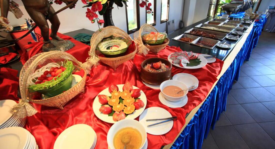 Еда хорошая. Завтрак вкусный. Каждый день в тазиках блюда меняются. Острое блюдо есть всегда! Можно заказать обед и ужин. Не дорого и вполне достойно, если лениво идти. Покупали живую тигровую креветку на базаре за светофором за 200 бат. Варили в тарелочках от местной лапши в микроволновке с кипятком из чайника, 1 кг креветки на 3 тарелки, 15 мин и вы со свежайшей креветкой.