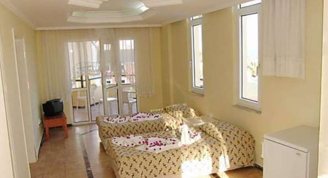 Начался наш кошмар когда нас привезли в отель... Мы приехали поздно вечером, часов в 22:00. Номеров свободных не было. Нам дали комнату, в которой видимо ночует персонал отеля. Как мы это поняли?! Эта комната находилась в пристройке которая слева от отеля если смотреть на него лицом, это что то типа общаги. Сказали это временные меры, до утра. В этой комнате нет ничего кроме прикроватной тумбочки и кровати двухместной. Комната от ванной отделяется дверью купе пластмассовой, очень ветхой. Ну ванна это тоже пипец, вы наверное поняли... Так как мы приехали поздно вечером решили осмотреть окрестности и придти лечь спать. Когда начали разбирать кровать, там было на простыне кровавое пятно (видимо кого то там лишали девственности) Я побежала скандалить на рэсепшен. Пришли конечно поменяли пастельное белье, но спать я там не могла комфортно, да и отдых конечно испортили с самого начала. Люди которые приехали с нами, ночевали на креслах возле рэсепшена. Они услышали скандал с пастельным бельем, потом они нам рассказывали, и они не решились в те комнаты временные заселяться. На след. день конечно переселили в номер, в отеле уже. Но номер конечно тоже не фонтан. На стене кровавые следы, видимо убивали там комаров... Воду горячую вечером отключали, приходишь вечером с моря и моешься ледяной водой. На этой почве у моего молодого человека начала опухать десна (флюс) и щека как у хомяка стала. Гид сказал, это не страховой случай, лечитесь сами. Мы своими силами снимали боль и опухоль. Лекарства в Турции дорогие.