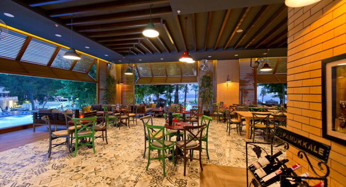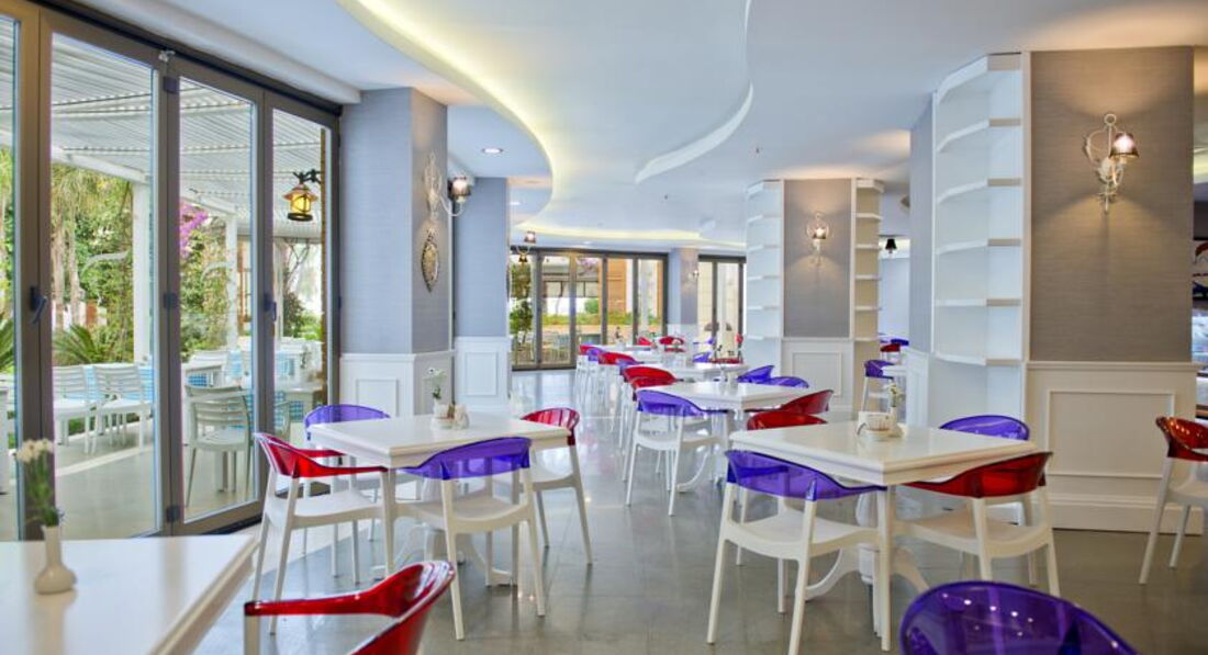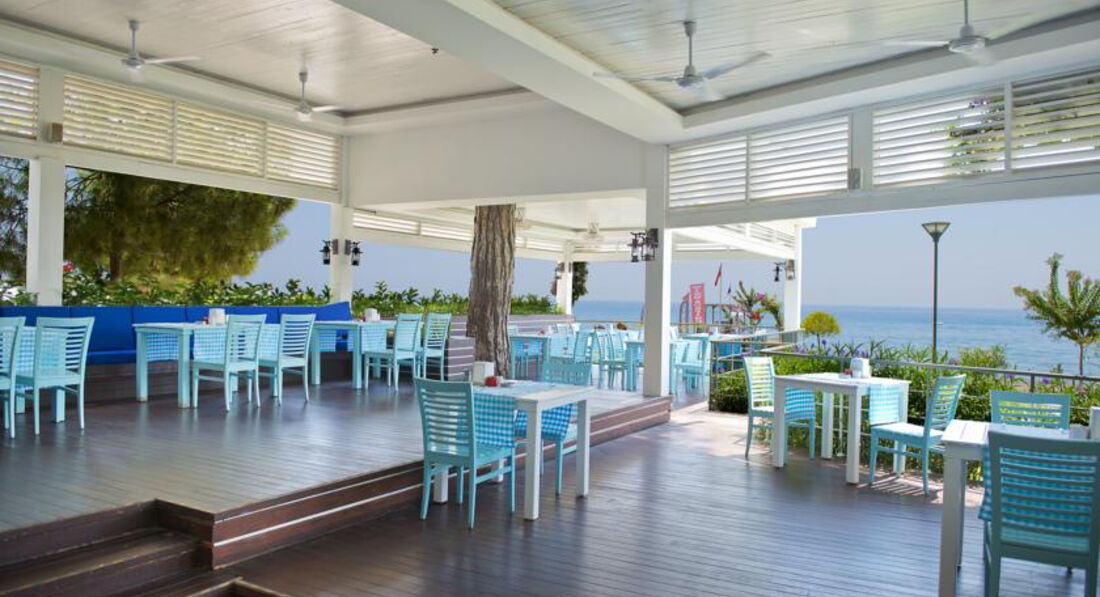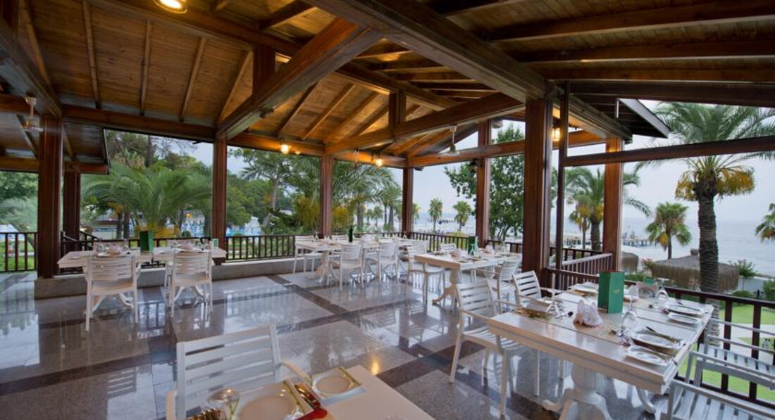 Бари та ресторани: головний ресторан розрахований на 750 осіб (критий, з кондиціонером, літня тераса, дитяче меню, дієтичне меню, дитячі стільці), лобі-бар (10:00-24:00), бар на пляжі (10:00- 24:00), диско-бар (23:00-02:00), вітамін-бар (08:30-20:30) та ін. 3 ресторани A la Carte: італійська, турецька, рибна - платно, за попередньою резервацією .