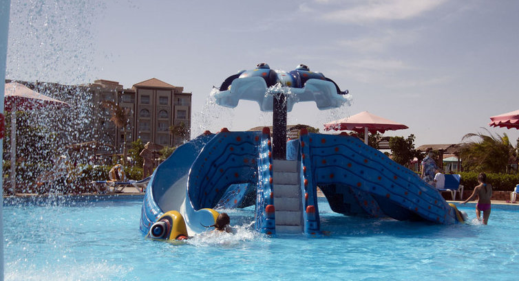 Теперь о территории. Столько зелени, цветов, кустов, деревьев я не видела ни в одном отеле!!! Куча бассейнов окружённых зелёными островками из клумб и насаждений! И просто шикарный вид из холла отеля! На территории большой аква-парк! Нам очень понравилось кататься на горках, особенно дети были в восторге! До морского пляжа нужно было идти минуты 2, но это было всегда наслаждением, проходить мимо этих клумб! Пляж чистый и ухоженный с достаточным количеством лежаков. Постоянно ходили работники: убирали мусор, расставляли уже ненужные лежаки, да и просто веселили отдыхающих. Море теплое и в этом отеле не глубокое, маленьким детям в самый раз, а взрослым приходилось до глубины идти далеко, и это наверное, единственный минус отеля. Но были бассейны, поэтому поплескаться было где.
