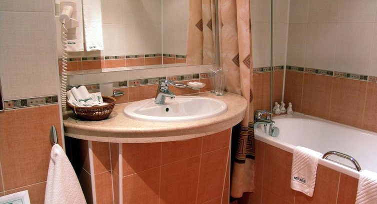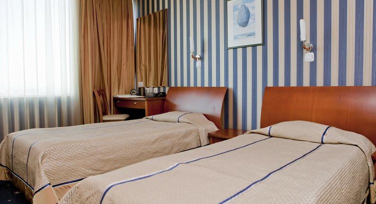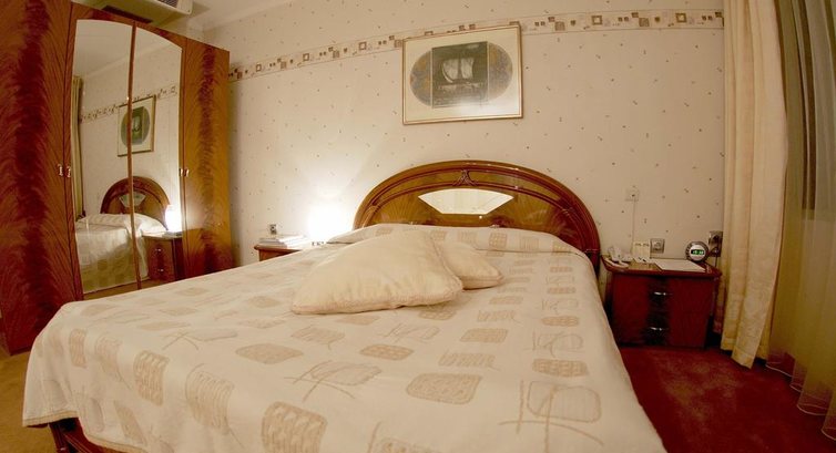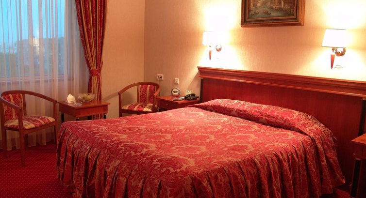 Номер поразил абсолютным стилистическим контрастом с внешней оболочной отеля. Нет, номер очень даже ничего, небольшая прихожая с подставками для чемоданов, шкафом и отдельно стоящими плечиками для рубашек, брюк и пиджаков, просторный санузел, комната с большой кроватью, тумбочками, письменным столом, невысоким шкафом с выдвижными ящиками и спрятанным в его недрах холодильником, для ребенка нормальная кровать. Но мебель, мебель в стиле «ископаемые мастодонты с бабушкиной дачи», все такое массивное, добротное, монументальное, темным древесным шпоном обшитое. Стол солидный такой, с разнокалиберными выдвижными ящичками, к нему тяжеловесный стул, об который видать пиво открывали разок – следок имеется, кто-то здесь в номере за столом важный работал, и чтоб не отрываться от государственных дел и зад свой не поднимать, не стал заморачиваться поисками открывашки, так, прямо, повернулся, и об стул, потом давай дальше указы писать…Вообще, это меня всегда удивляло, почему, если в мини-баре есть бутылки с крышкой, которую надо открывалкой открывать, открывалка в номере отсутствует, выдавали бы ее на reception тогда, мебель целее была бы. Текстиль на кровати спокойной расцветки и качественный, так же как и плотные шторы. В санузле чисто, хорошо – по четырехзвездному, все работало и фен был и ванна, никаких загончиков со шторками, бортиков и дырок в полу. Полотенец достаточное количество, и, что мне всегда нравится в держащих марку отелях – флакончики с гелем для душа и шампунем на ванне организованным табунчиком толпятся, щетки зубные с пастами в фирменных упаковках в стаканчиках болтаются, мыльца крохотные около раковины положены. К недостаткам номера можно отнести то, что окно глухое, не открывается, нет балкона, зато шумоизоляция хорошая, уличного шума не слышно, лично я здесь на удивление крепко спала, несмотря на то, что кровать была на редкость скрипучая, при малейшем движении издавала сказочные звуки поворачивающейся избушки на курьих ножках.