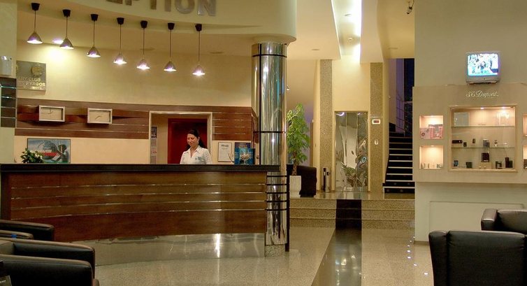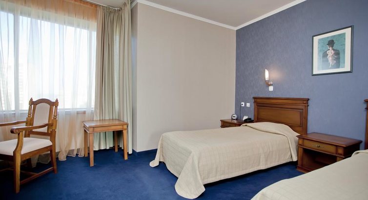 В стоимость проживания у нас был включен завтрак. Ресторан выглядит солидно, в классическом винтажном стиле, с добротной тяжелой мебелью, обилием текстиля на окнах, ковролином на полу, картинами в увесистых рамах, контрастными полосатыми обоями – интерьерным трендом на протяжении нескольких веков, растениями в кадках, словом, чуть нафталиновый, но приятный и уютный интерьер. Чисто, звучит спокойная музыка, вежливая девочка-официантка суетится, народу совсем мало, кроме нас всего пару человек. Завтрак стандартный для отеля с таким показателем звездности, качественно и вкусно. Колбаска, сыр, сосиски, бекон жаренный, яйца, омлет, блинчики, помидоры, огурцы, сирине, кисело мляко, джемы, мед, выпечка хорошая, баницы, мякицы, хлопья, фрукты – арбуз, апельсины, чай в пакетиках, несколько видов, кофе из автомата, нектары (не юппи), что заканчивается, мгновенно подносится. К ресторану придраться трудно, сколько звезд на удостоверении звездности фигурирует, стольким, а именно 4-м, он и соответствует, на мой взгляд, но вот если бы он был на одном из верхних этажей, тогда, полагаю, из-за панорамного вида недостатка в посетителях здесь не было бы.