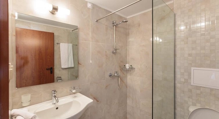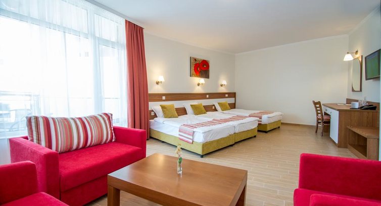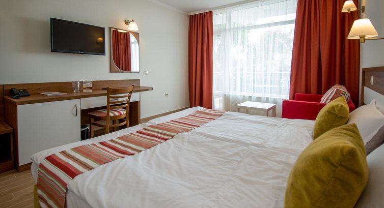 Просторный, светлый. Мебель в хорошем состоянии, ЖК-телевизор (есть российские каналы: 1-ый, СТС, ТНТ – насмотрелась на годы вперёд, кажется «НТВ»). Холодильник/минибар пустой (вода не предусмотрена концепцией), из утвари – только 2 стакана. Кровати широкие, белоснежное постельное бельё (меняют 2 раза в неделю). На балконе - раскладная сушилка для белья. Сейф на рецепции – 30 лева за неделю.