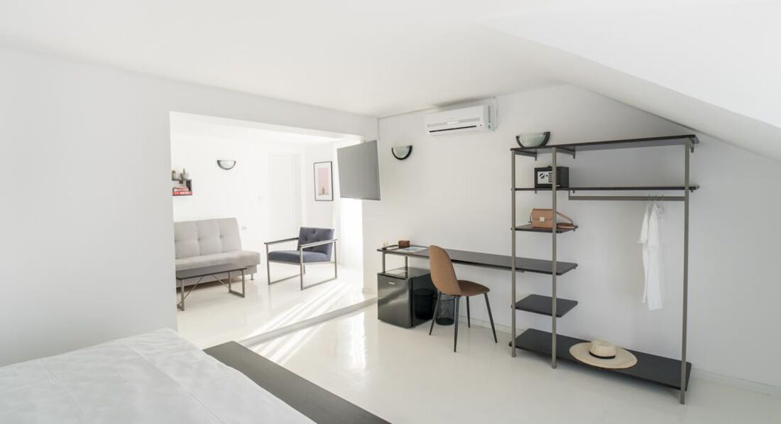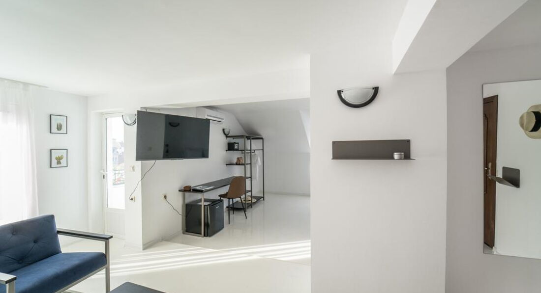 • One bedroom apartment deluxe (35 кв.м.) – ренововані номери: спальня, зона вітальні, двері немає, балкон з видом на місто
