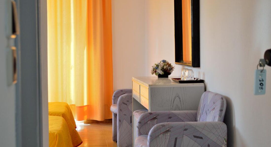 Типи номерів: Standard Garden View (20 кв.м., макс. розм. 2 дор.). 1 спальня та 1 ванна кімната, є балкони у всіх номерах. Вид з номеру на сад.У номері: душ фен кондиціонер (40 євро на тиждень) ТБ прямий телефон міні холодильник стіл і стільці wi-fi (безкоштовно) сейф (15 євро на тиждень) балкон покриття в номері - плитка