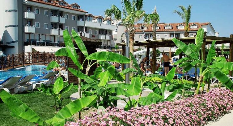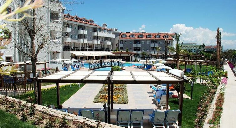 территория- ее почти нет, но она особо и не нужна. это плюс потому что людей не очень много. люди в основном из германии и турции и это тоже плюс. есть батут и красивые деревья.