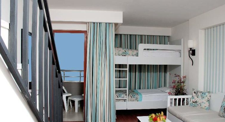 Номер двухэтажный, на первом этаже три спальных места: двухэтажная кровать для детей и односпальная кровать в виде деревянного диванчика, а также шкаф, холодильник, телевизор с 3-мя русскими каналами, ванная комната с душем и туалетом, маленький балкончик со столиком, двумя стульями и сушилкой. На втором этаже двухспальная кровать и такой же набор из шкафа, холодильника, TV, душа с санузлом, еще есть стол с зеркалом. Балкона на втором этаже нет. Кондиционеры и фены присутствуют на двух этажах. Номер светлый, небольшой, но очень уютный. Каждый день оставляли две бутылки с водой. Постельное белье меняли раз в три дня, полотенца всегда были чистые. У нас убирал мужчина, все очень чисто, а песка после возвращения детей с пляжа было много , каждый день ваял что-нибудь красивое из полотенец и лепесточков цветов.