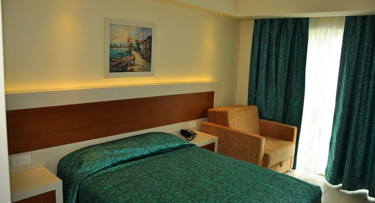 НОМЕР. В отель мы прибыли около 11 часов, поселили сразу. Достался хороший корпус под номером 4 (корпуса №2,3 находятся чуть дальше от центра отеля), но последний этаж. Думаю, что на других этажах, комнаты были чуть просторнее, с ровным потолком и окном от самого пола, а в нашем номере был ступенчатый потолок и высокая ступенька к балконной двери. Но это - мелочи. В целом, номер хороший: современная очень удобная мебель (кровать и зеркало с подсветкой), симпатичные занавески и покрывала на кроватях, два зеркала ( в полный рост и у туалетного столика), холодильник (в нем было 2 бутылочки воды при заселении),сейф (мы не пользовались), плоский телевизор с нашим первым каналом, кондиционер, который можно настроить на требуемую температуру. Вобщем, все необходимое есть. Кроме того, тапочки, иголка с нитками, шапочка для душа, ватные палочки. Прекрасная ванная комната с просторной душевой кабиной и современной сантехникой; есть фен, жидкое мыло для рук, шампунь и гель для душа. Убирали в комнате каждый день, правда, постель не заправляли совсем. На балконе два плетеных стула, столик и металлическая пепельница. Вид с балкона был прекрасным: и море, и горы, и небо с парящими парапланеристами, да и весь Олюдениз в целом, так как отель располагается на последней линии и немного выше уровня моря.