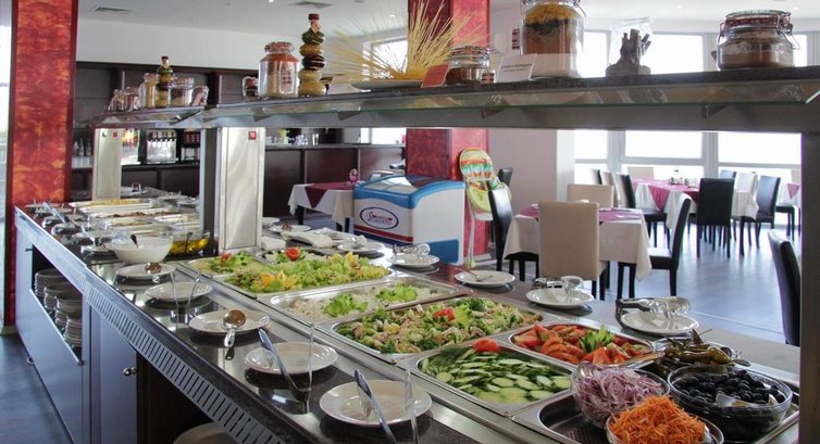 Питание "все включено": твердая пятерка. Относительно стандартные завтраки с возможностью выбора из мясных нарезок, различных свежих фруктов, овощей и салатов, различные мюсли и овсянка. Если не лениться и заглянуть в бар на террасе, можно стать счастливым обладателем горячих блинчиков или яичницы-глазуньи. Обед и ужин: непременно два супа на выбор, разнообразные мясные и (реже) рыбные блюда; уже упомянутый бар обеспечит различными вариациями на тему гриль-шашлык: стейки, колбаски, шашлычки мясные и овощные и т.д. Выбор напитков большой: чай (черный, зеленый, фруктовый), кофе, вода с апельсиновым/вишневым сиропом, пиво, коктейли, белое и красное вино, автомат с напитками Пепси/7up/Mirinda. Немного не хватало соков, но это уж скорее черта Болгарии в целом (немногие отели там предлагают соки в меню).