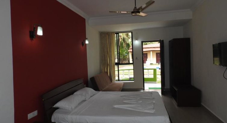 Нас заселили в одноэтажный корпус, номер комнаты 6. В номере большая кровать, диванчик, 2 прикроватных тумбочки, шкаф, телевизор, холодильник, чайник. Телевизор с местными каналами, мы включали музыкальный, слушали индийские и зарубежные песни ). Каждый день приносили 2 бутылки воды, пакетики чай, кофе, сахар, сливки. Душ отделен шторкой и на пару миллиметров ниже уровня остального пола. Маленькие бутылочки гель для душа, шампунь, кондиционер, ставили новые, если заканчивалось, туалетная бумага. Полотенец по одному на человека. Нам меняли их 2 раза. На крыльце (назову это так) 2 пластмассовых стула, пепельница. Вечерами иногда сидели там, пили ром, общались с соседями. Один раз стул у нас куда-то пропал, попросили работника отеля второй стул, он нам принес.