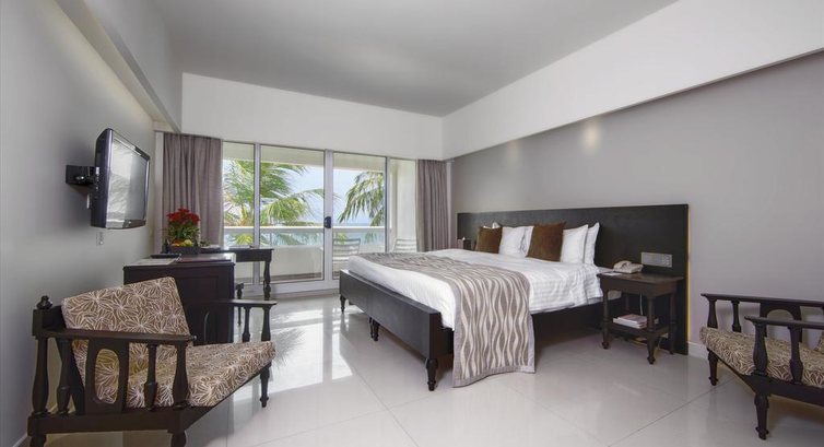 Отдыхали в этом отеле 2 дня, переехали в него из другого отеля, где не было собственного пляжа, а хотелось спокойно искупаться и позагорать, так как на общем пляже очень много местных жителей, ведущих себя шумно и развязно и таращившие на тебя глаза, как в цирке. Впечатления от отеля двоякие. Номера очень старые, все убитое, самое лучшее в номере-вид с балкона на пляж и океан. На рецепшене тяжело общаться, местный английский понимали с трудом, глотают слова, служащих, владеющих русским языком, нет, хотя могли бы и иметь, даже в Сигирии есть владеющие русским гиды. В общем, объяснялись с трудом, многое осталось непонятым, особенно с оплатой и депозитом. Рестораны дорогие, к счету добавляются проценты, особенно в баре около бассейна. Сам бассейн маленький, для такого отеля просто неприлично иметь такой убогий бассейн. Кругом столы и веранда ресторана, плаваешь, а на тебя глазеют закусывающие туристы. Пляж отличный, большой и пустынный, лежаки, зонты, душ и туалет, есть естественная тень. В ресторане на пляже вечером ужины при свечах, морепродукты и рыба (недешево, цены, как в Москве). Выйти из отеля некуда. Кругом маленькие неосвещенные улицы, ходить вечером просто страшно, никаких супермаркетов и кафе, местные ходят толпами, впечатление неприятное. В общем, прожив 2 дня, мы поняли, что 3 дня было бы много, так что отъезд прошел без сожалений. Такси подали вовремя, новая чистая машина, по стоимости-в 2 раза дороже, чем в Москве доехать до аэропорта. С оплатой отеля так и осталось много невыясненных нюансов.
