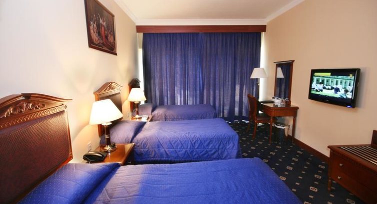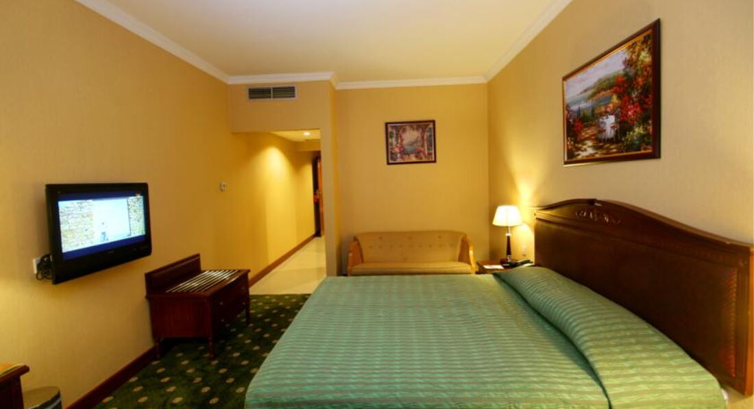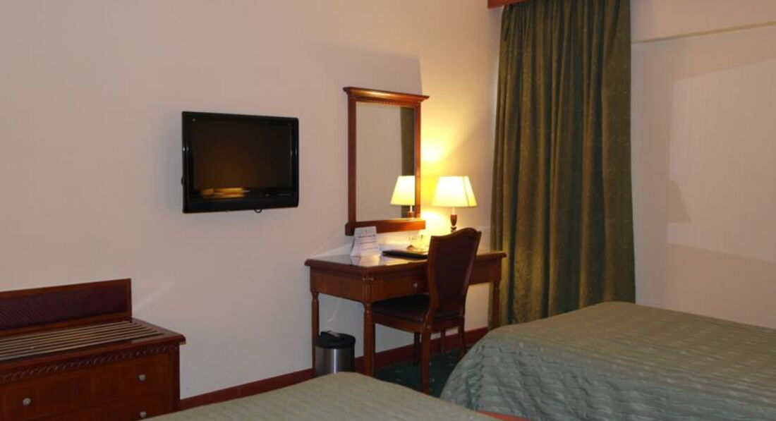*** Номер довольно просторный, огромная кровать, тумбочки, трюмо, шкаф. Телевизор показывает три наших канала: НТВ, ТНТ и ТВ3 (бесплатно). Санузел вполне приличный, вот только напор воды очень слабый. Ещё минус - это небольшой шум: по правой стороне отеля - от центрального кондиционера, по левой стороне - от дискоклуба. Жил над установкой кондиционирования, оказалось лучше, чем над клубом. В каждом номере установлен электронный сейф (бесплатно).