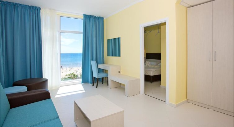 Отличный отель! Отдыхала с дочкой 15 лет с 13 по 27 июля. Отель находится,можно сказать , прямо на берегу Черного моря. Начну по порядку. Встречала компания Bon Tour. Приехали в отель в 10 утра, заселили в 12 часов. Сразу одели браслеты и можно было пользоваться всеми привелегиями отеля. Территория отеля маленькая, на территории находиться снек-бар и бассейн. Номер 1602 двухкомнатный ( прихожая, гостиная с угловым диваном, столик, тумбочка с телевизор и выходом на балкон, вторая комната с двухспальной кроватью, прикроватными тумбочками, вешалка, телевизором на стене и , опять же, выходом на балкон) - ПРОСТО СУПЕР. Питание отличное и на любой вкус. Мясо ( жареное пареное ....), салатики, бутерброды, канапе, супчики (очень вкусные), картошка ( жареная вареная печеная...), макароны, плов с морепродуктами и многое- многое другое вкусное. Во время нашего отдыха было отключение света в отеле на сутки, но это не помешало поварам так же вкусно нас кормить. Большое им СПАСИБО!!! Каждая просьба на ресепшене выполнялась мгновенно. Привет из России всему персоналу отеля. Огромное Вам спасибо за наш отдых. Отдельное спасибо и пламенный привет нашему гиду Эмилии. Отель буду рекомендовать своим знакомым и друзьям.
