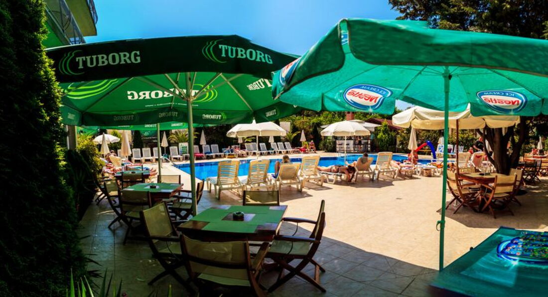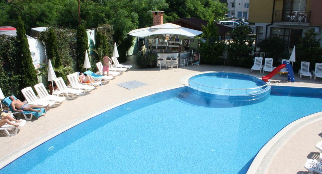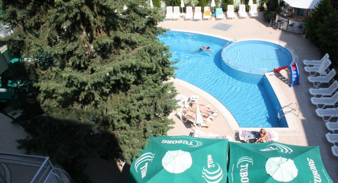 Про бассейн - там была всего пару раз. Он очень маленький. Но мне понравилось, что вся территория с лежаками огорожена декоративной стеной от других отелей, создавая очень уютное и приятное пространство. На лежаках загорают в основном болгары - они составляют основную часть отдыхающих в отеле. Русских туристов единицы (никто, видимо, не хочет ехать после грозных отзывов об отеле). И немцы еще есть.