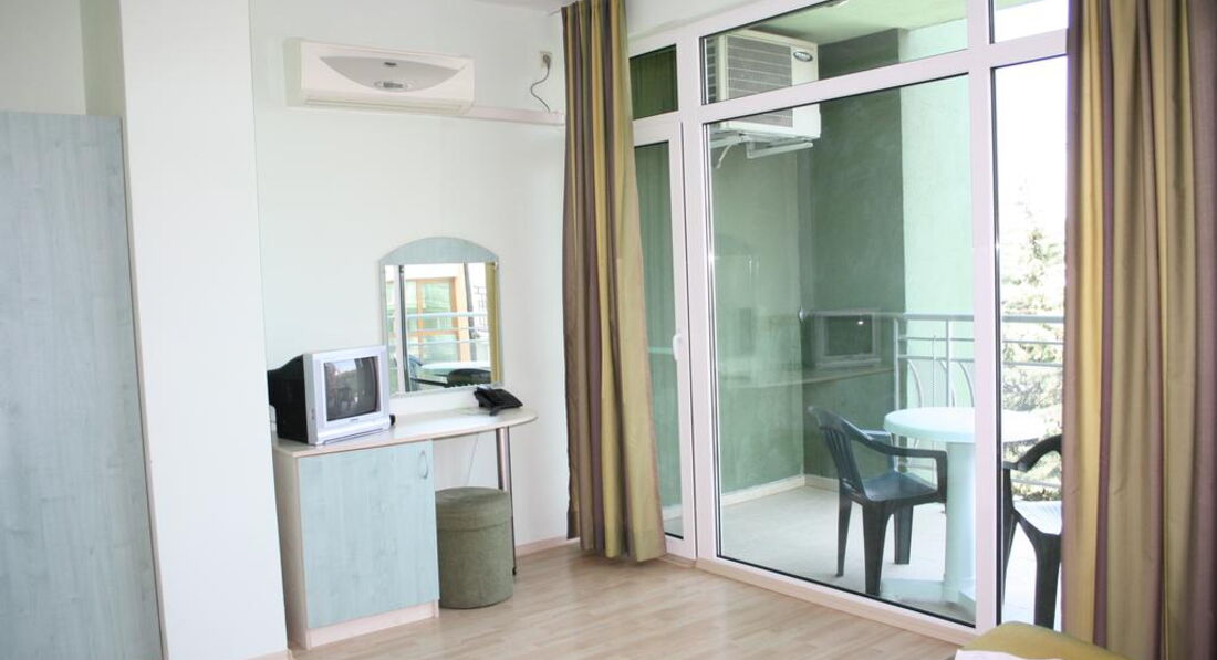 Номер хороший, все исправно работало. Есть балкон, маленький, но есть. Там два стула и стол, стандартно вобщем. Вся сантехника приличная. Единственное, что не очень понравилось: отсутствие душевой кабины или ванны, или хотя бы шторки. Когда купаешься, брызги сильно летят. Но я так поняла для Болгарии это нормально.