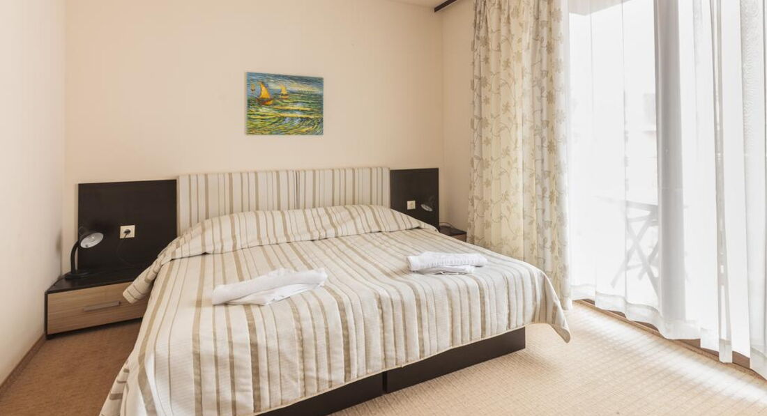 Отель очень чистый и аккуратный для спокойного семейного отдыха (рядом нет безумной толпы как на первой линии)!!!!!!!Очень уютный дворик можно вечером с детьми "поваляться" в гамаке и на качелях, поигать в волейбол полежать у бассейна, были свидетелями как немцы дрались за шезлонги у бассейна(в отеле по моему БУРГАС первой линии).Минимум шума. Номера убирают каждый день,полотенца меняют через сколько дней честно не помню,но если бы редко то думаю я бы запомнила!