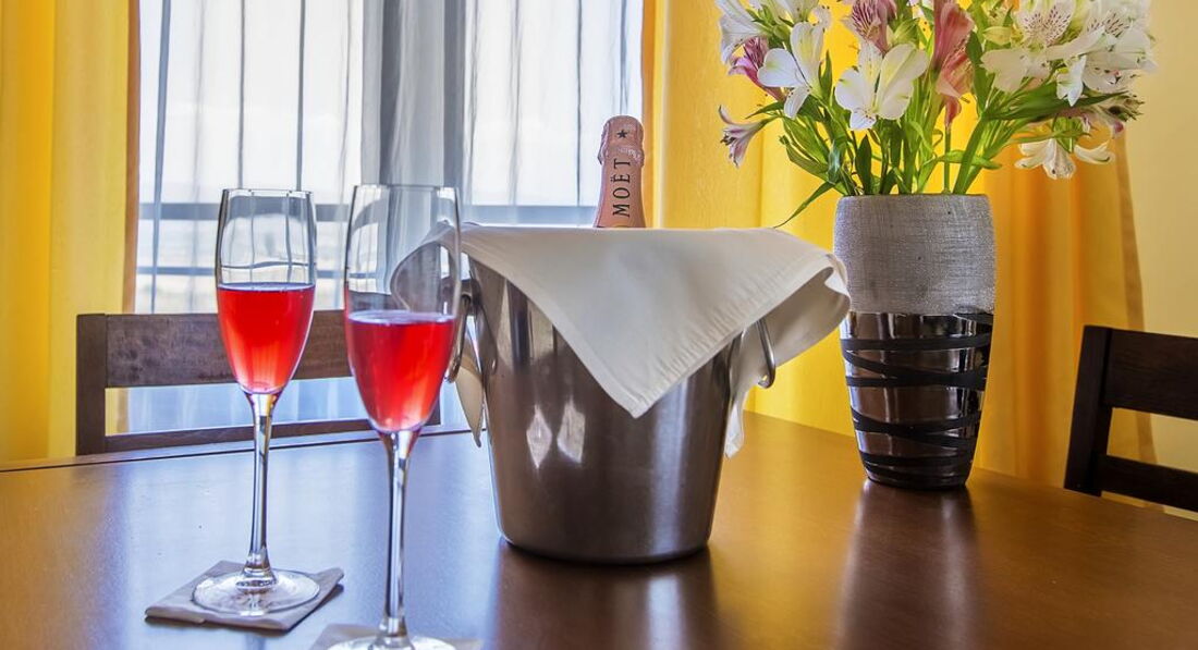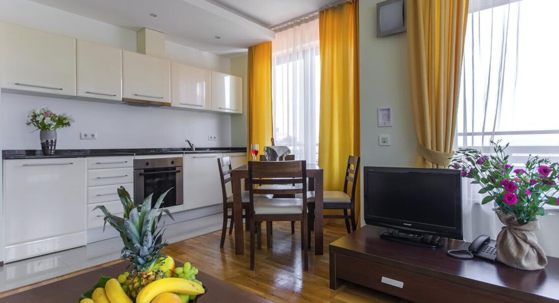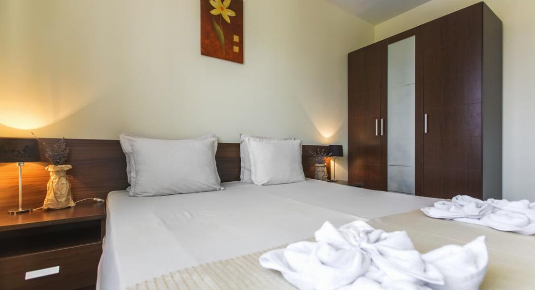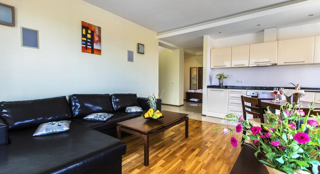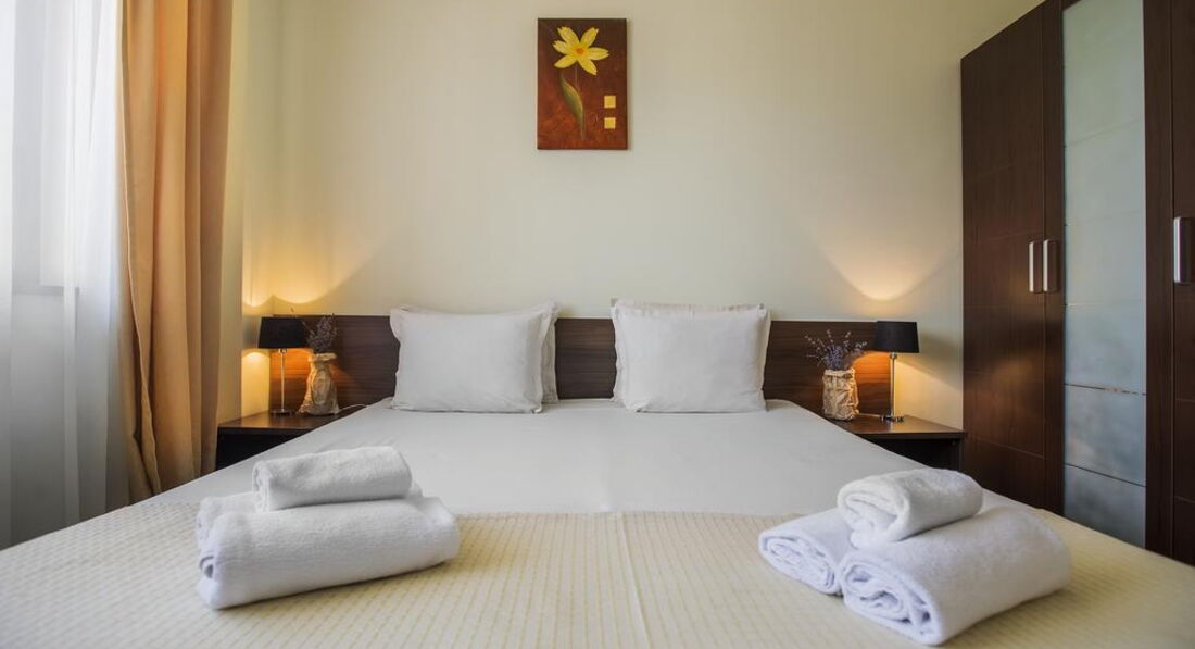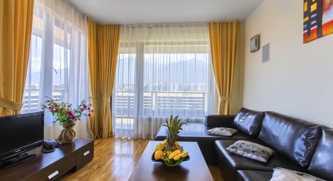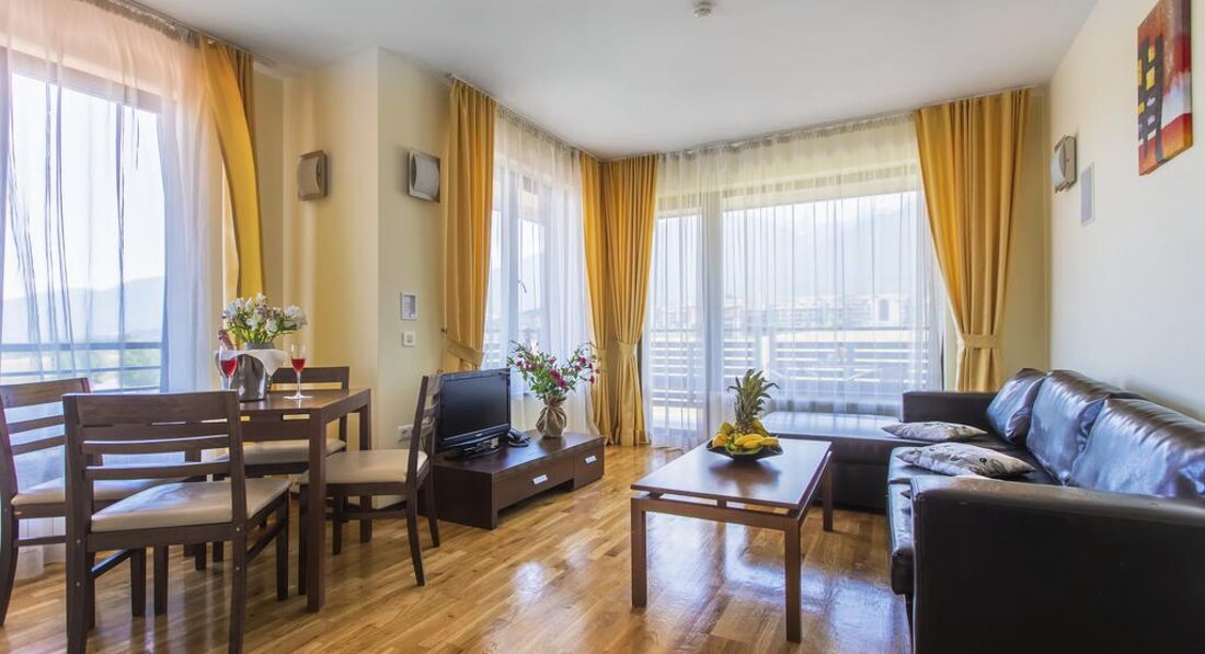 Apartment 1 Bedroom (вітальня з м'якими меблями та одна спальня, розділені дверима. Два окремі ліжка. Електричний чайник. Кухонний посуд – за додаткову плату. Фен та праска на рецепції (безкоштовно). Має спільну закриту передпокій із сусіднім. Загальний балкон із сусіднім номером.)