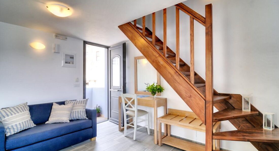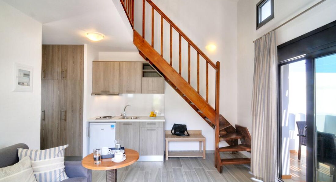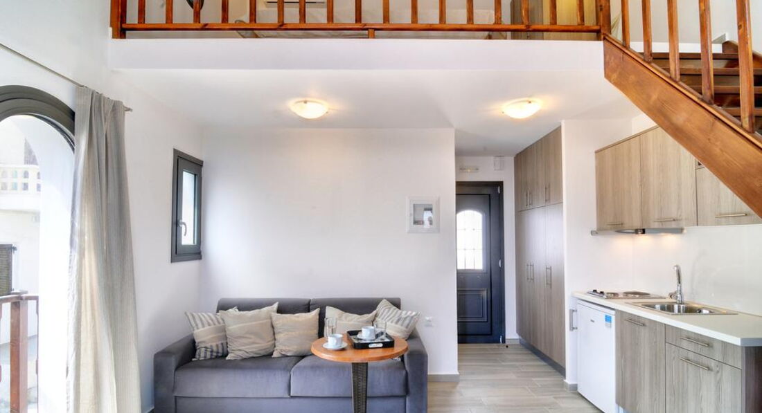 Maisonette Seafront | макс. 4, вітальня з кухонним куточком та двоспальним диваном на першому рівні, спальня з двоспальним ліжком на верхньому рівні.