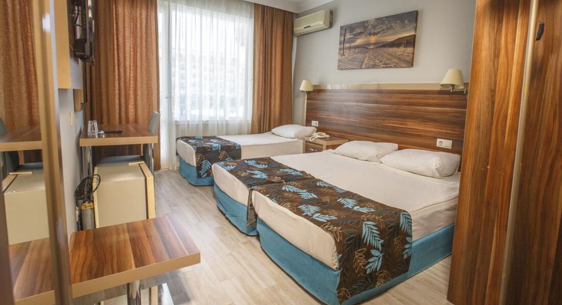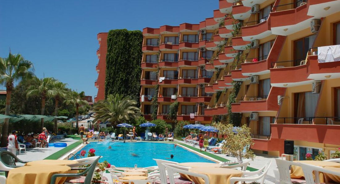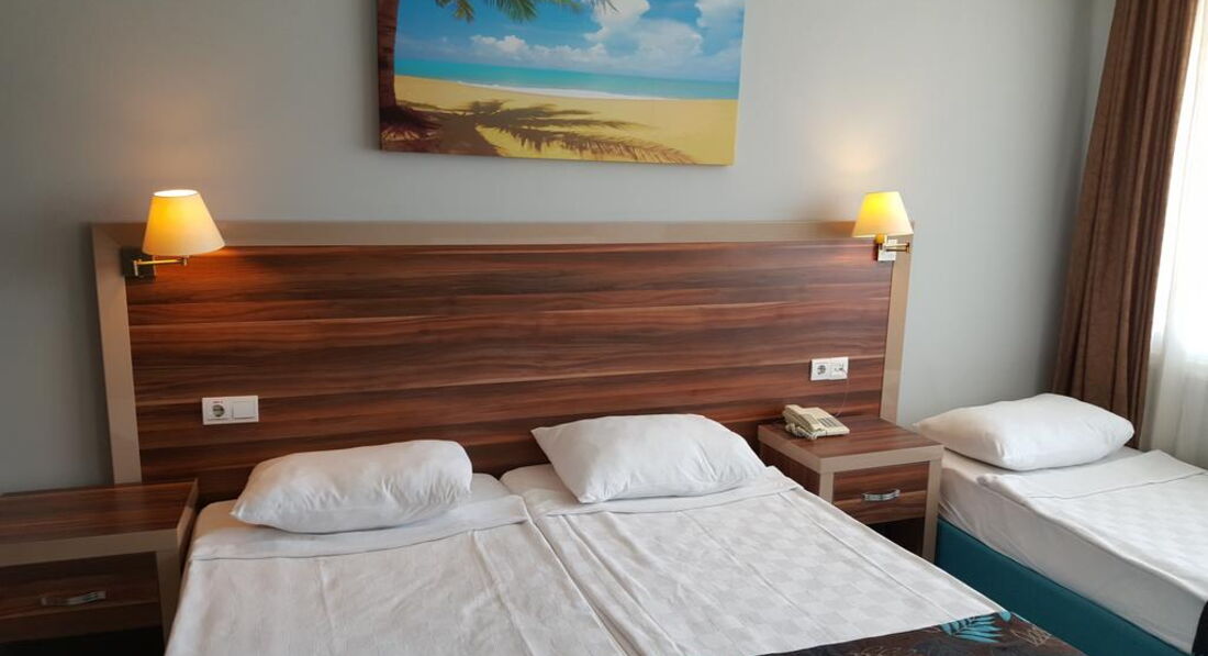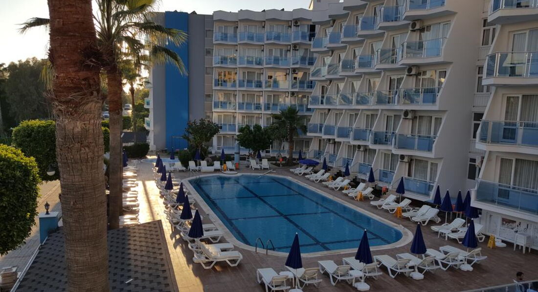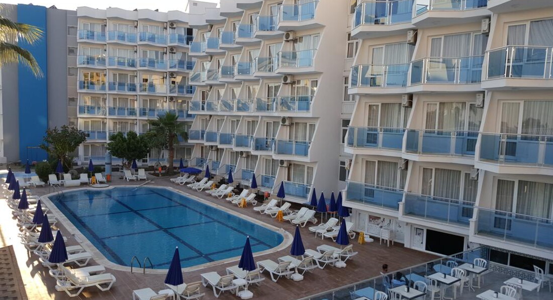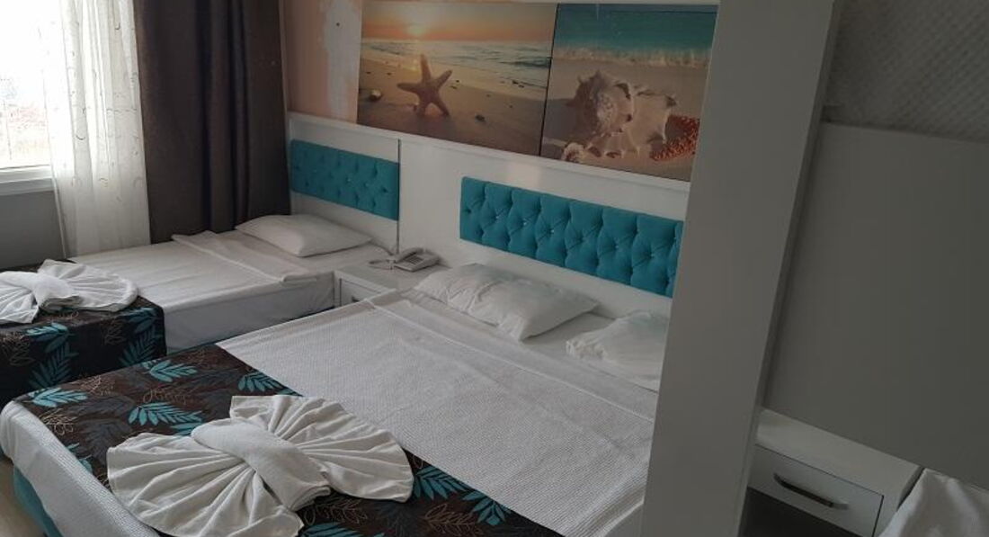 Это была первая поездка в Турцию. Приехали в отель, примерно, в 8 часов вечера, нас сразу же проводили на ужин, затем выдали ключи от номера. Номер небольшой, обставлен в стиле СССР) Мебель старая, пошарпаная, но чистая и аккуратная. В номере стояло 2 кровати, тумбочка, будуар, если его можно так назвать, телевизор, небольшой платяной шкаф. В ванной комнате всё стандартно: умывальник, унитаз и душ. В душе очень плохо сходила вода, поэтому в ванной всегда было мокро. Полотенца чистые, меняли раз в 2 дня, постельное так же. Оставляли чаевые 1$ через день и из полотенец нам лепили гуськов на кроватях. Окно номера у нас выходило на море. Сама территория отеля небольшая, я бы сказала маленькая, всё компактно. Персонал дружелюбный и внимательный. До моря минут 5 пешком, но дорого проходит не по очень чистой территории. на пляже лежаки, матрасы бесплатно, песок чистый, пляж постоянно убирали. В баре на пляже только напитки, так же на пляже можно было взять вкуснейшие лепёшки, но очередь заа ними надо занимать заранее. Около отеля есть пару небольших супермаркетов и небольшой базар. Анимация была каждый вечер. В общем, если Вы приехали лежать на море, а не сидеть в отеле, то отель вполне может сойти. Рекомендую его только для переночевать и покушать (еды, кстати, тоже хватало, но очереди были сумасшедшие и не всегда хватало столиков), но я бы в этот отель не вернулась
