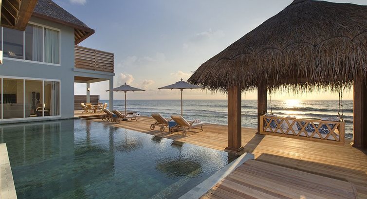 1 Naladhu Two Bedroom Pool Residence (600 м ², макс. 3+3 чол.). Двоповерхова вілла з двома спальнями, терасою, приватним басейном (95 м²), обіднім павільйоном, вітальнею та кухнею. На другому поверсі розташовані спальня з ліжком king-size, вбиральня, ванна кімната з зливовим душем та ванною, балкон з видом на океан. На першому поверсі: спальня з ліжками twin, гардеробна та простора ванна кімната з ванною, душем на відкритому повітрі та душем у приміщенні.
