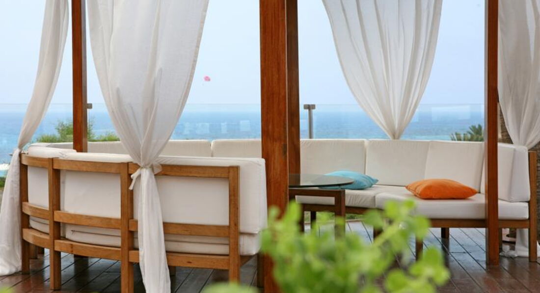 10 Executive Bungalow (32 м2, макс. 4 чол.) - спальня та зона вітальні, ванна кімната, простора тераса зі столом та двома стільцями, вид на басейн та вид на море.