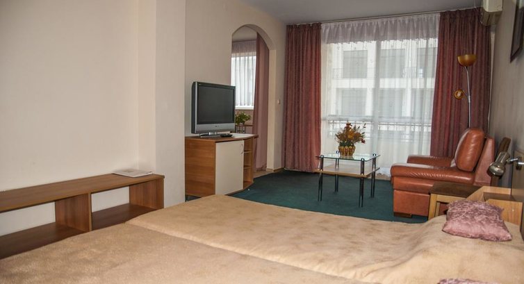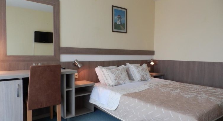 Заселили нас как и положено - после 12.00. 3 этаж.. Номер чистый, вкусно пахло розами...мм))) Санузел без перебоев работал, горячая вода круглосуточно. Большая кровать, бельё меняли раз в неделю. Этого вполне достаточно, мы же не грязнули). По сути, есть всё необходимое. Шкаф, стол, тумбочки, светильники, картины, телевизор, холодильник, стаканы, все дела...))) Был балкон со столиком и стульями, часто ужинали там...атмосфера улётная. Видно море и курорты Албена и Кранево с балкона (потому что отель на возвышенности). Очень всё красиво!
