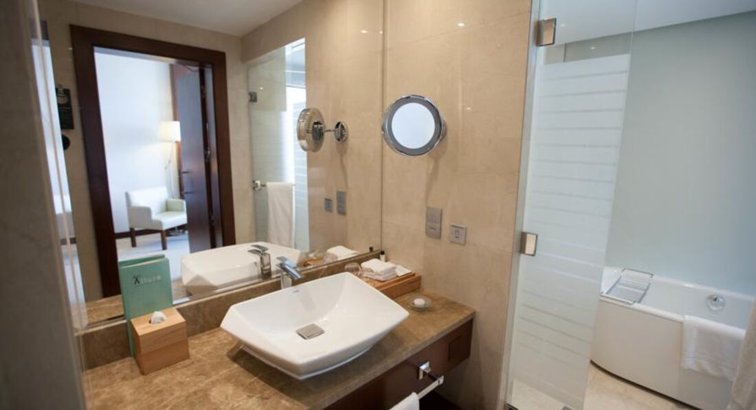 Расположен отель практически в центре Дубая, при этом на такси из аэропорта – минут 15, не больше. Восторг начался прямо от входа – очень красивая зона ресепш, очень приветливый персонал, все сделали молниеносно и проводили в наш номер. Номер потряс. Очень просторный, по-хорошему дизайнерский, чистота как в операционной. Ванная с окном, вид нереальный! Все очень технологично – есть пульт, которым можно регулировать свет во всех помещениях, поднимать-опускать шторы… Конечно же, бесплатный wifi.